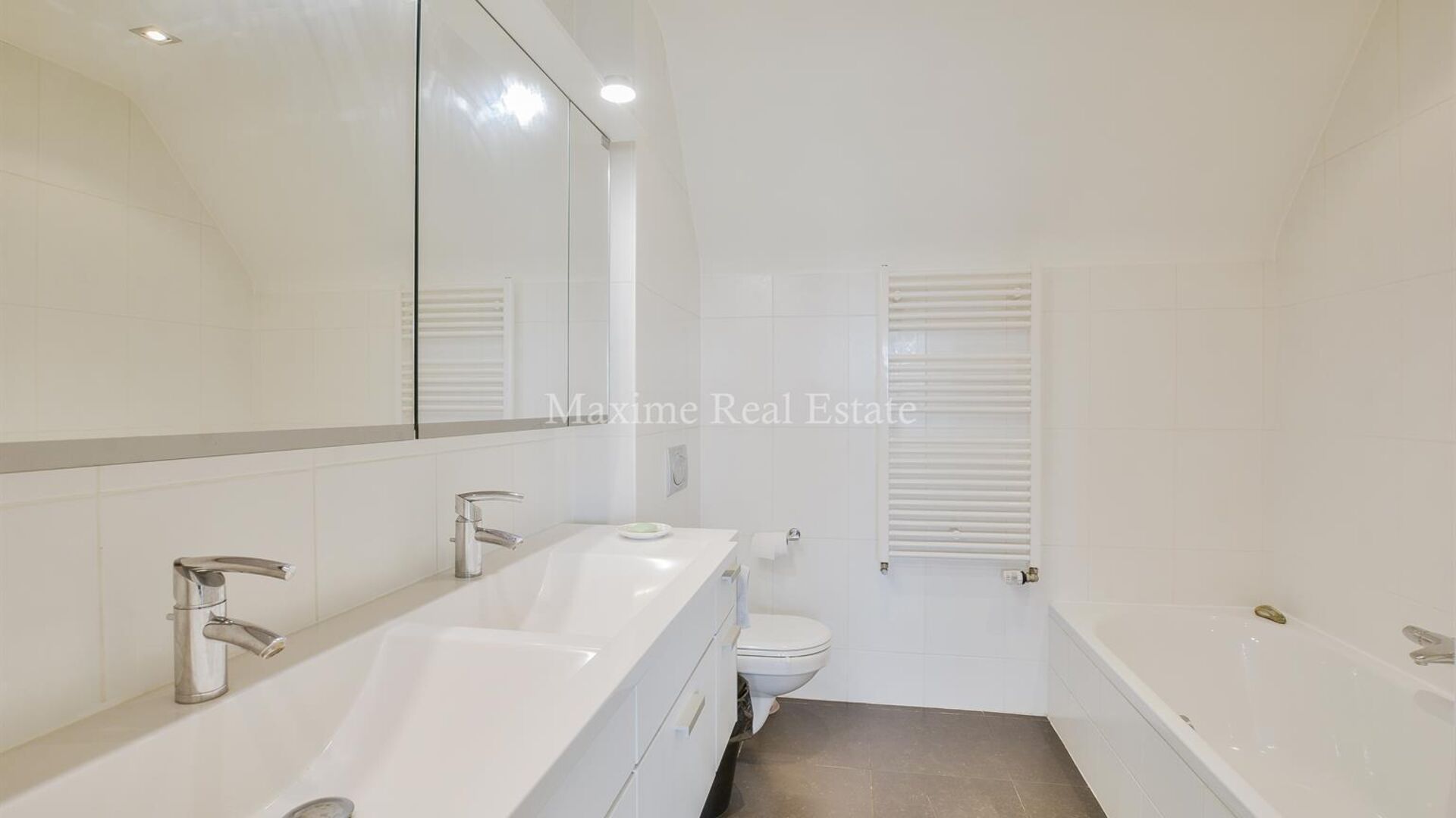 Hall de nuit, deux belles chambres de ±17 m² et ±15 m², salle de bains avec baignoire, double évier et toilette, salle de douche indépendante (douche + évier), toilette séparée.