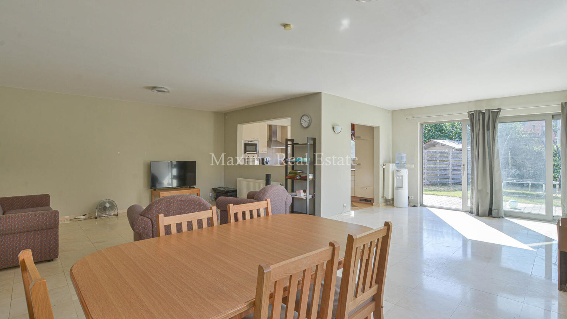 Rez-de-chaussée: Hall d'entrée avec toilette séparée et vestiaire, buanderie, garage pour 1 voiture + place de parkings dans l'allée, lumineux séjour-salle à manger lumineux de +/- 40m² donnant accès au jardin et à la terrasse (entièrement clôturé), cuisine entièrement équipée (taques, hotte,lave-vaisselle, micro-ondes, frigo/congélateur).