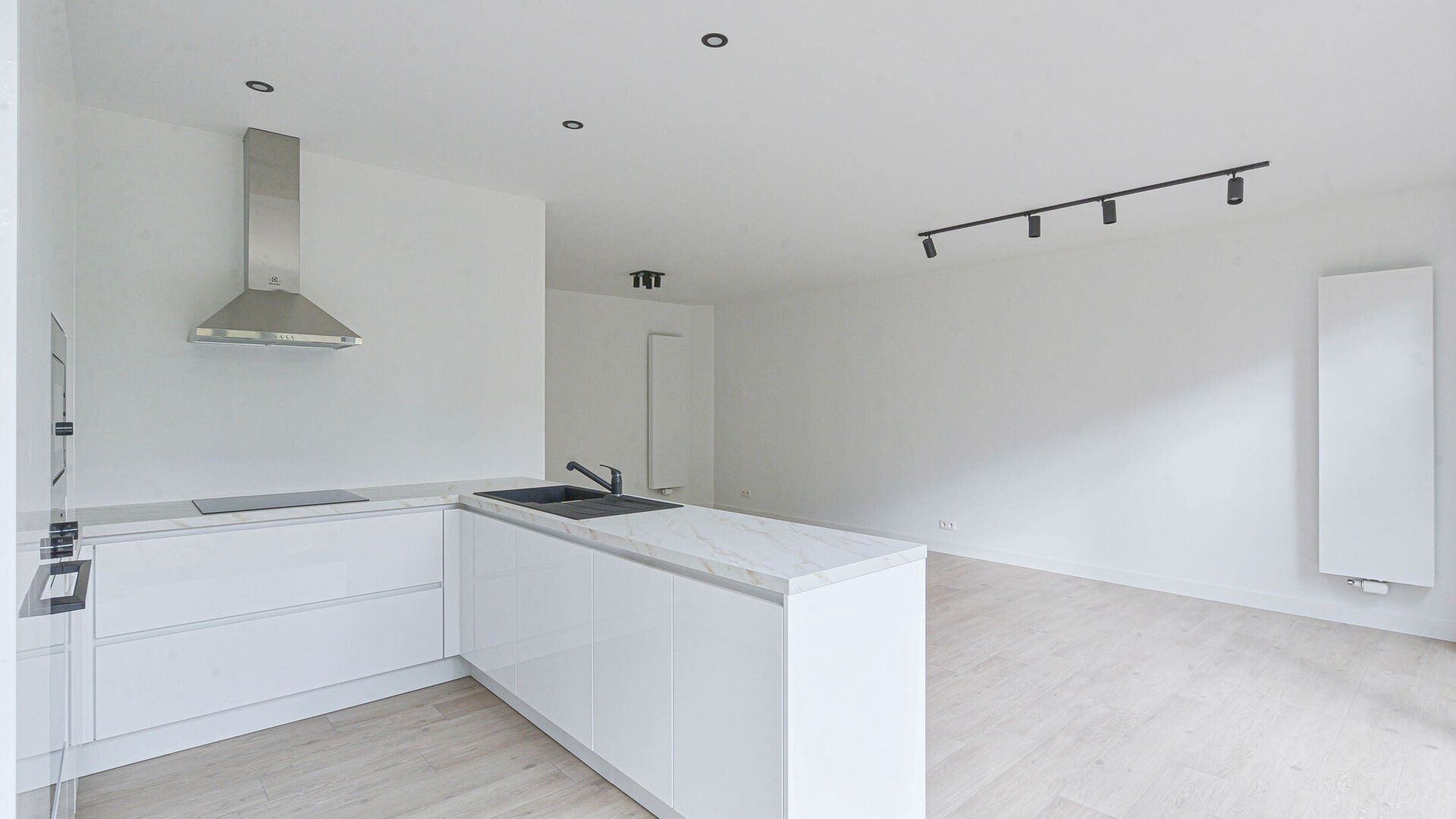 Rez-de-chaussée : Hall d’entrée avec toilette invités et espace vestiaire, séjour – salle à manger d’environ 24m² avec cuisine ouverte entièrement équipée (taque de cuisson, four, réfrigérateur/congélateur, lave-vaisselle), 1ère chambre à coucher +/-15m² avec salle de bains attenante.