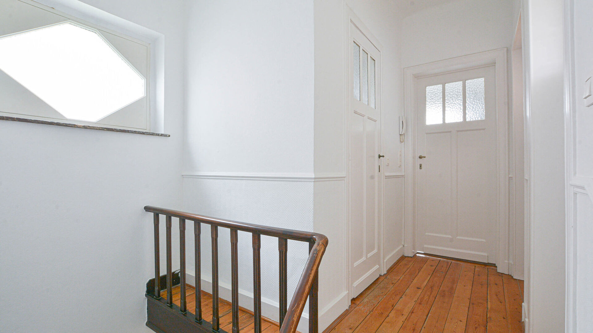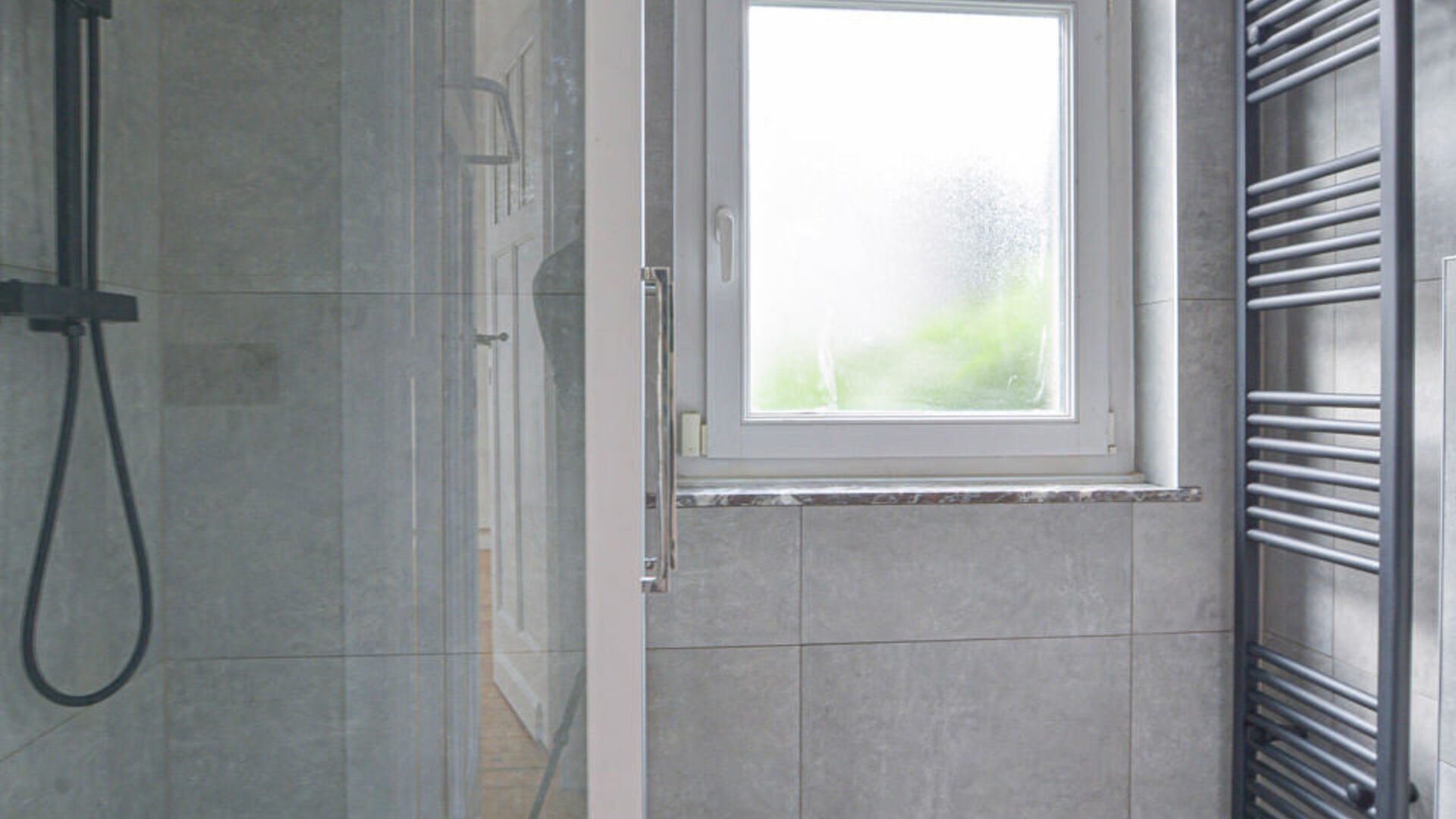 1er étage : Hall de nuit, 2 chambres à coucher +/-16-11m², salle de bains (baignoire, toilette, lavabo) et une salle de douche.