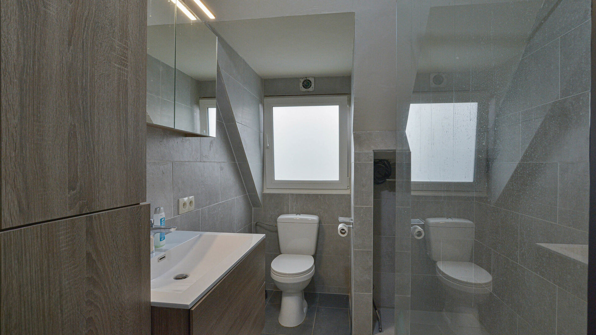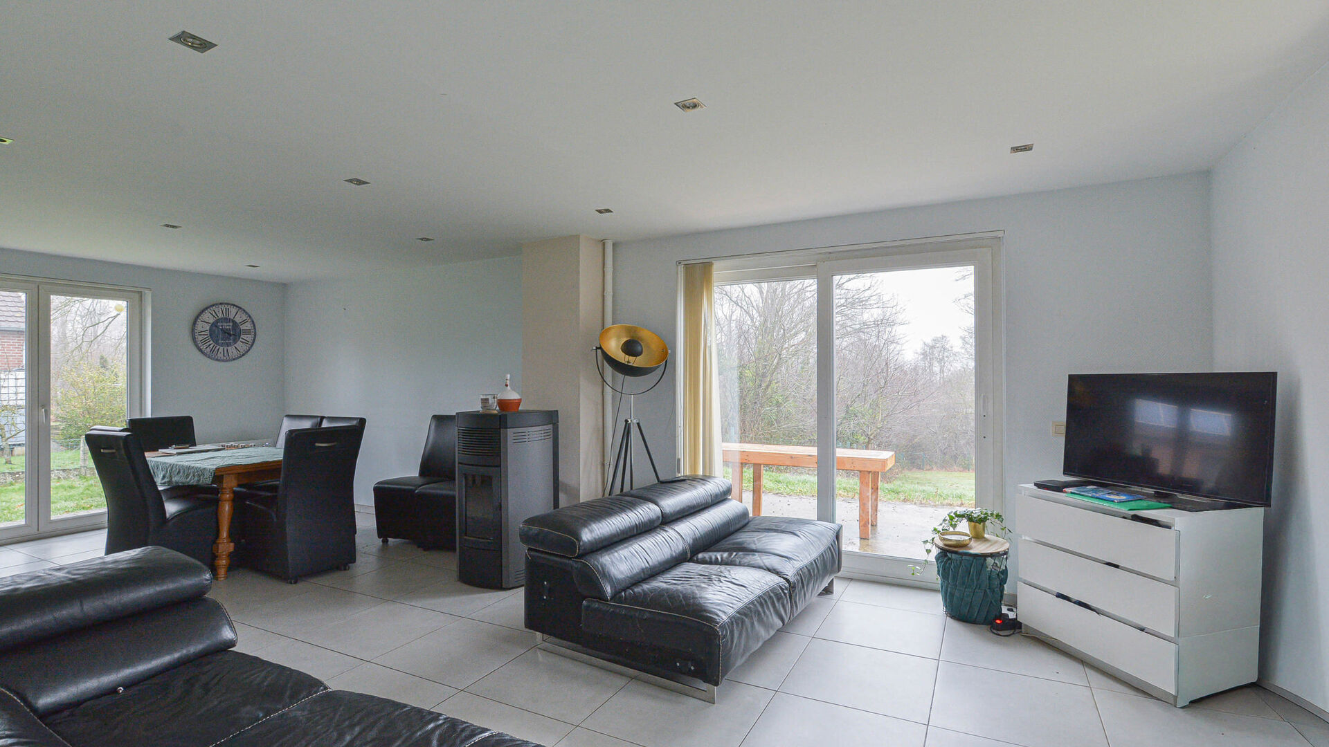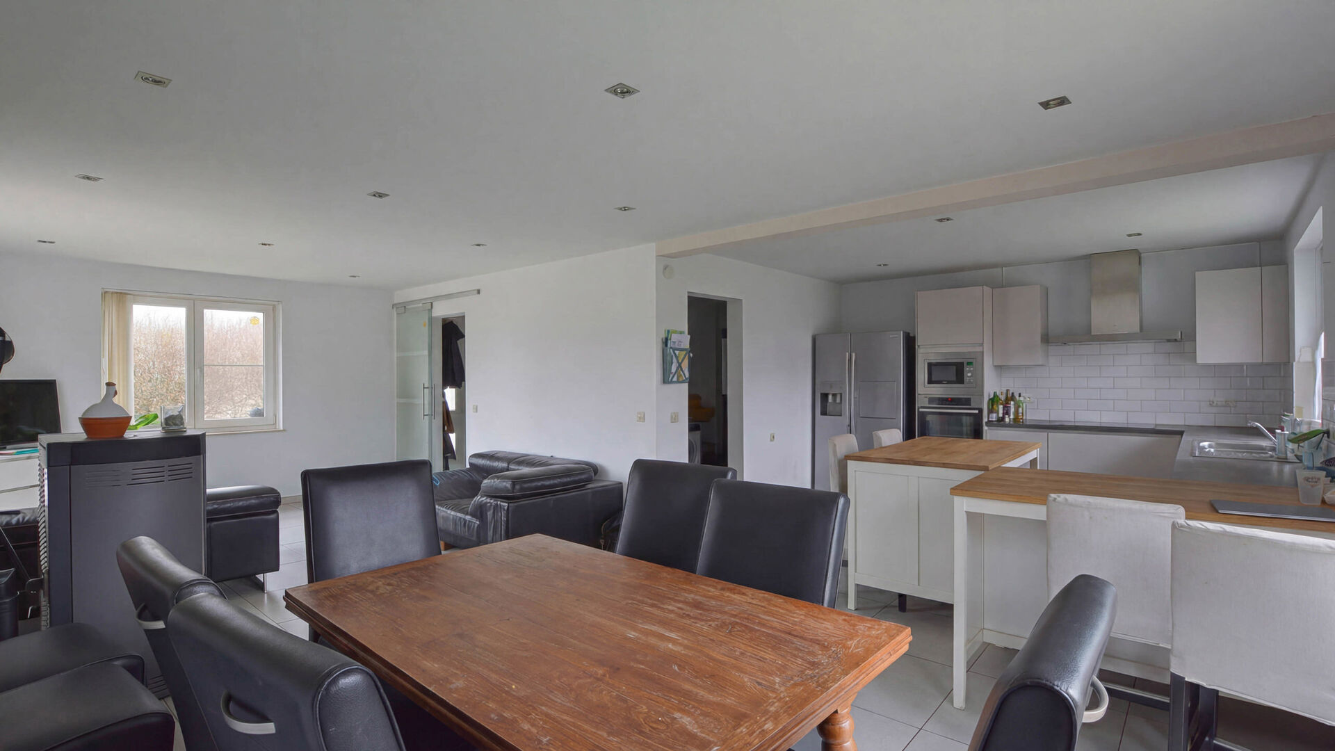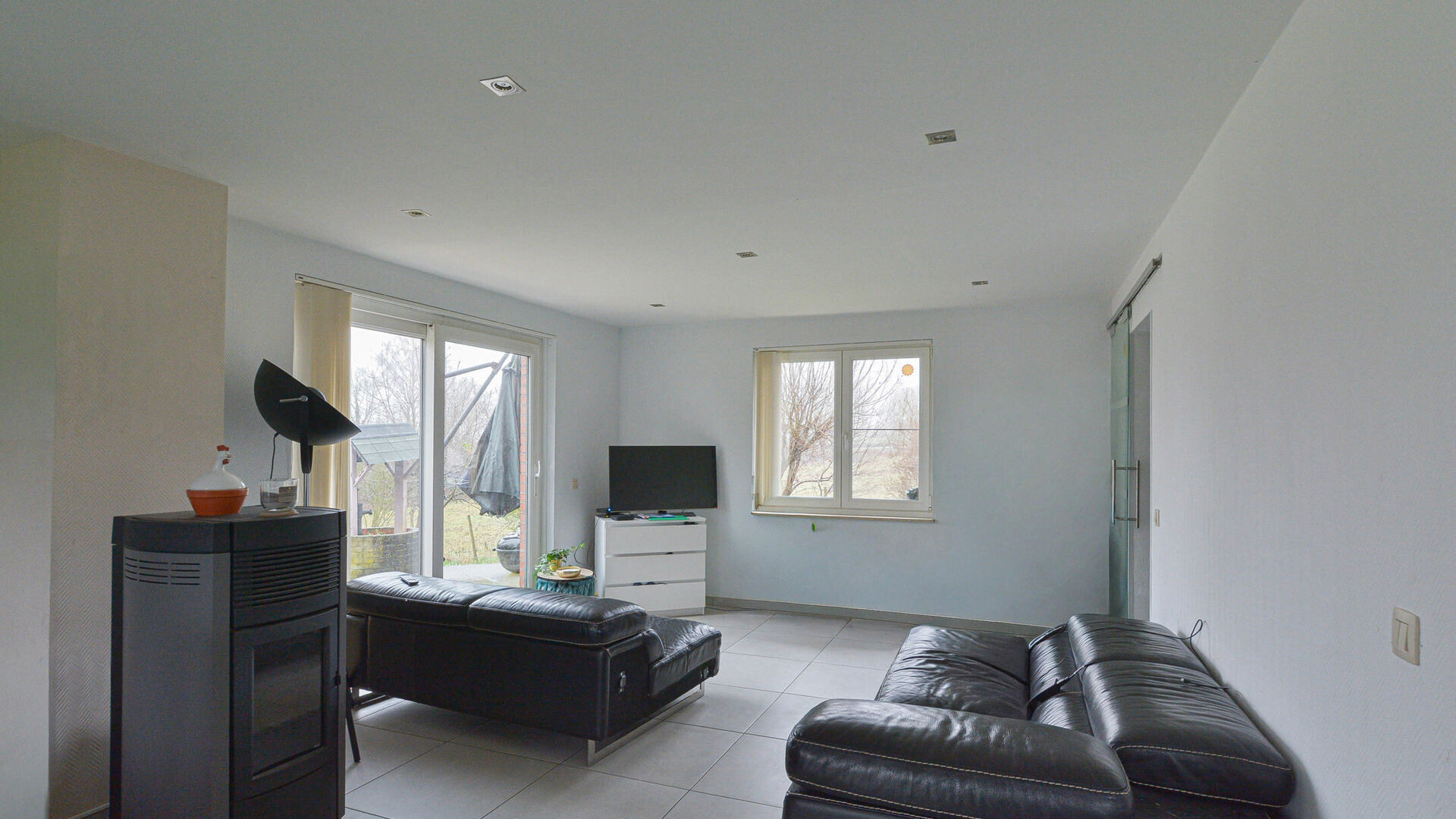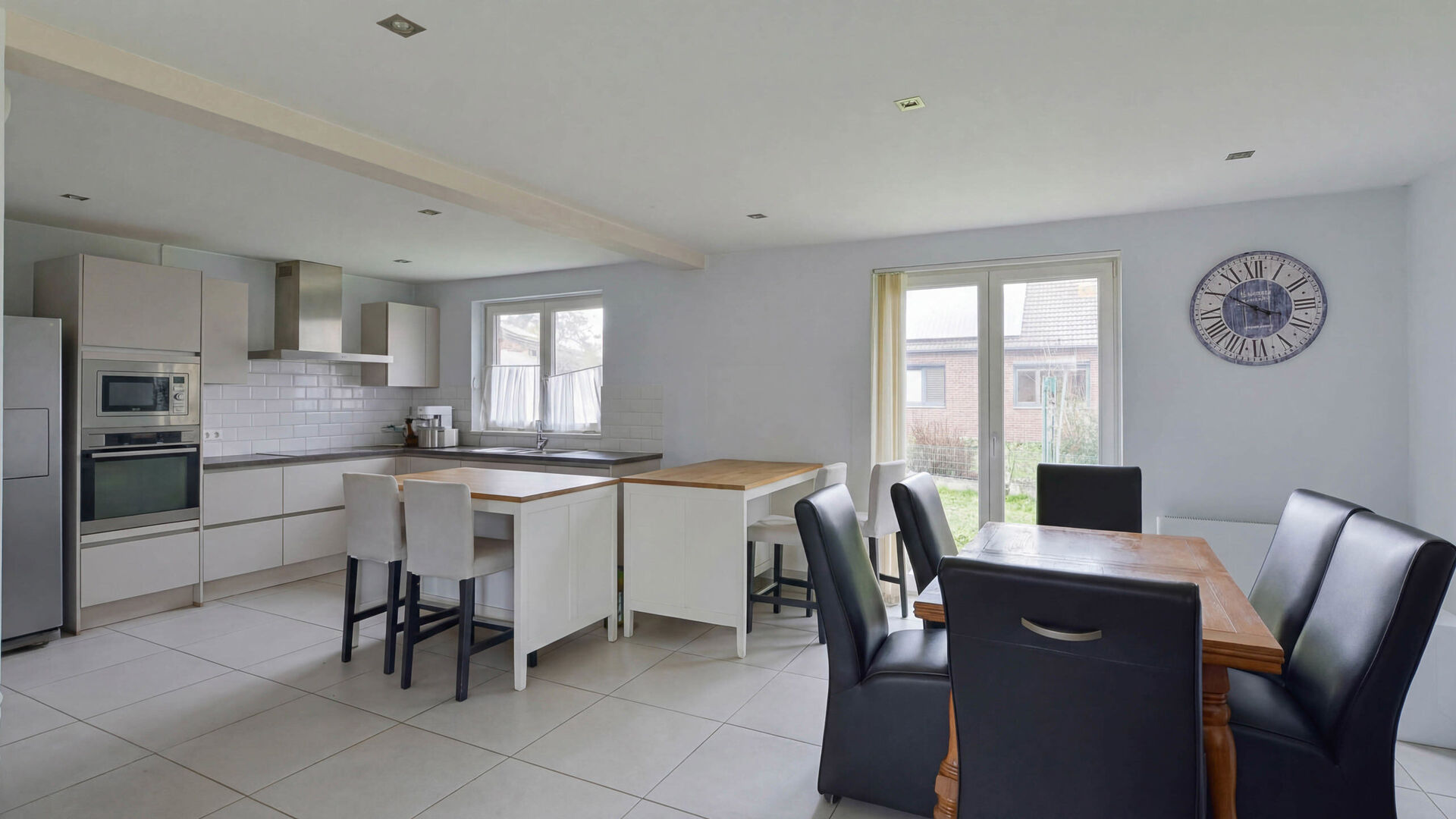 Rez-de-chaussée : Hall d’entrée avec toilette, séjour-salle à manger de +/-30 m² avec cuisine ouverte super-équipée, terrasse et spacieux jardin avec abri de jardin.
