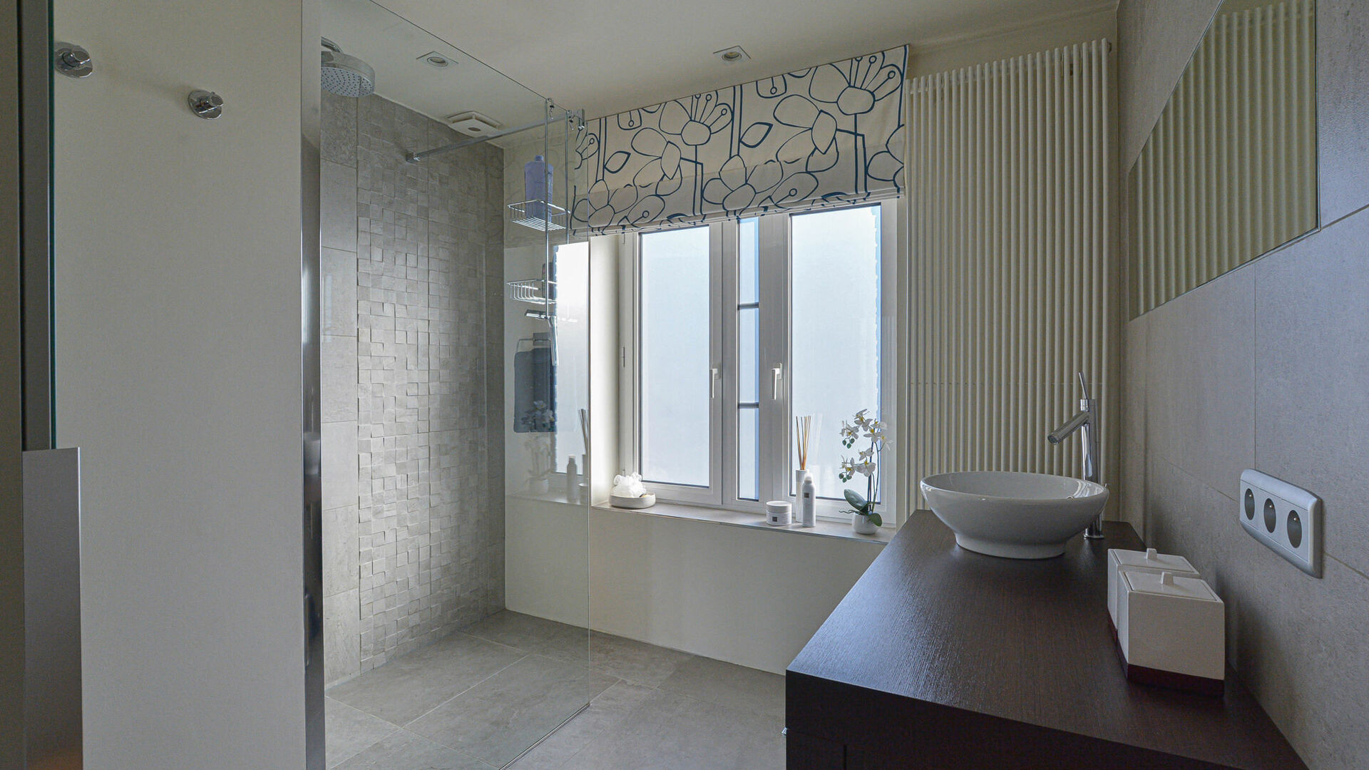 Le premier étage comprend un hall de nuit, deux chambres confortables (±17 m² et ±10 m²), dont une actuellement utilisée comme dressing, ainsi qu’une salle de bain moderne équipée d’une douche à l’italienne et d’un meuble lavabo.