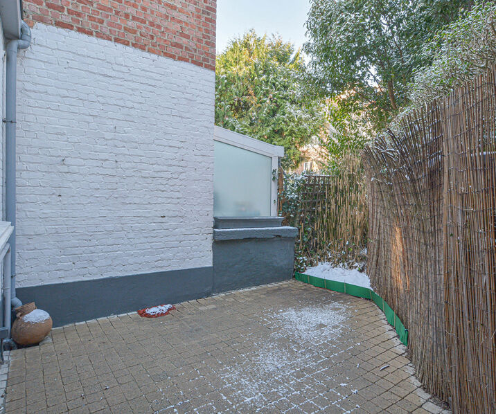 Rez-de-chaussée: Hall d'entrée avec toilette séparée, lumineux séjour-salle à manger +/- 24m² donnant accès à la cour de +/-20m², cuisine super-équipée donnant accès au sou-sol.