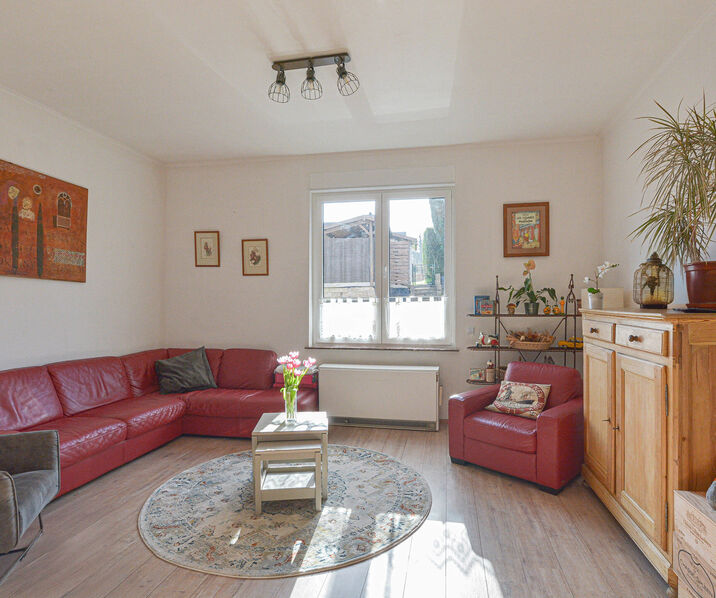 Rez-de-chaussée : hall d’entrée, lumineux séjour-salle à manger de +/-38 m² avec feu-ouvert, cuisine moderne entièrement équipée donnant accès au jardin et à 2 agréables terrasses. Au rez-de-chaussée, vous trouverez également une première salle de bains (baignoire avec douche, évier et WC), une buanderie et un garage.