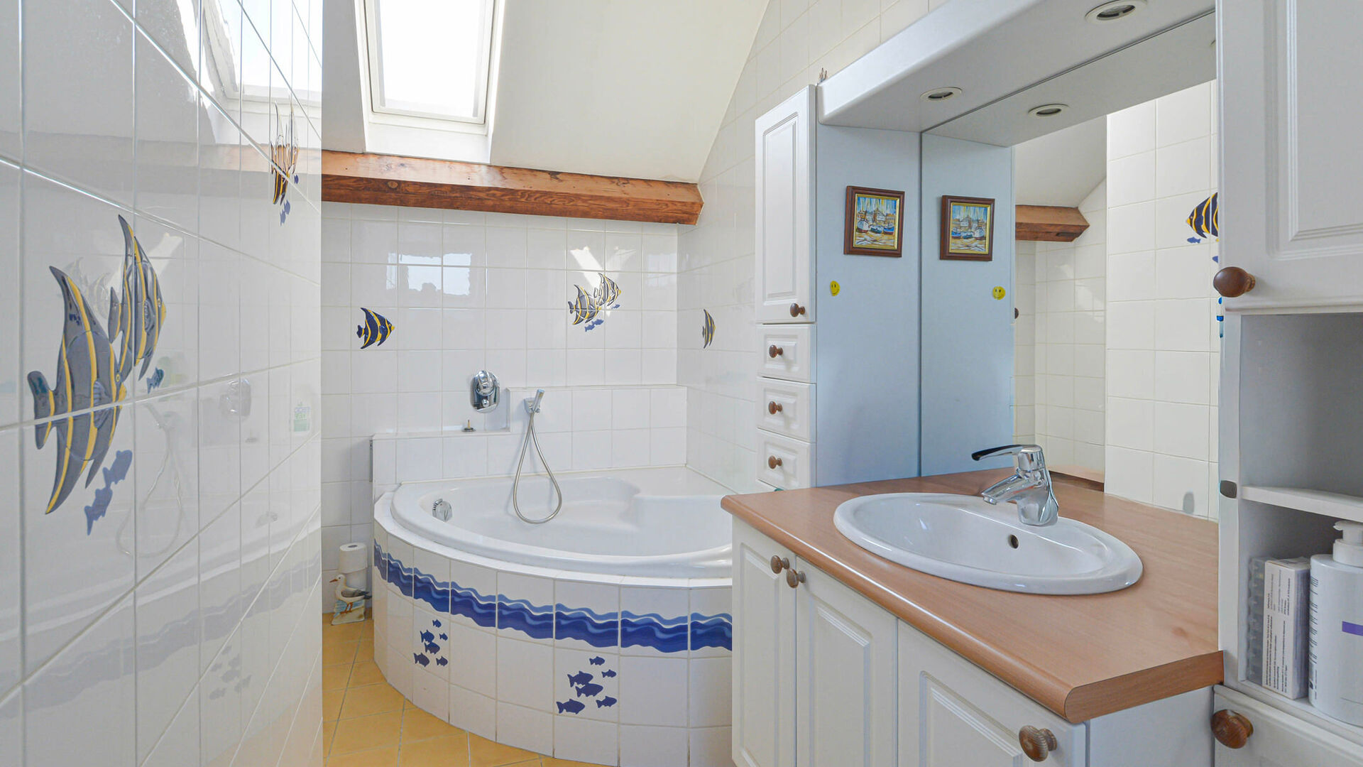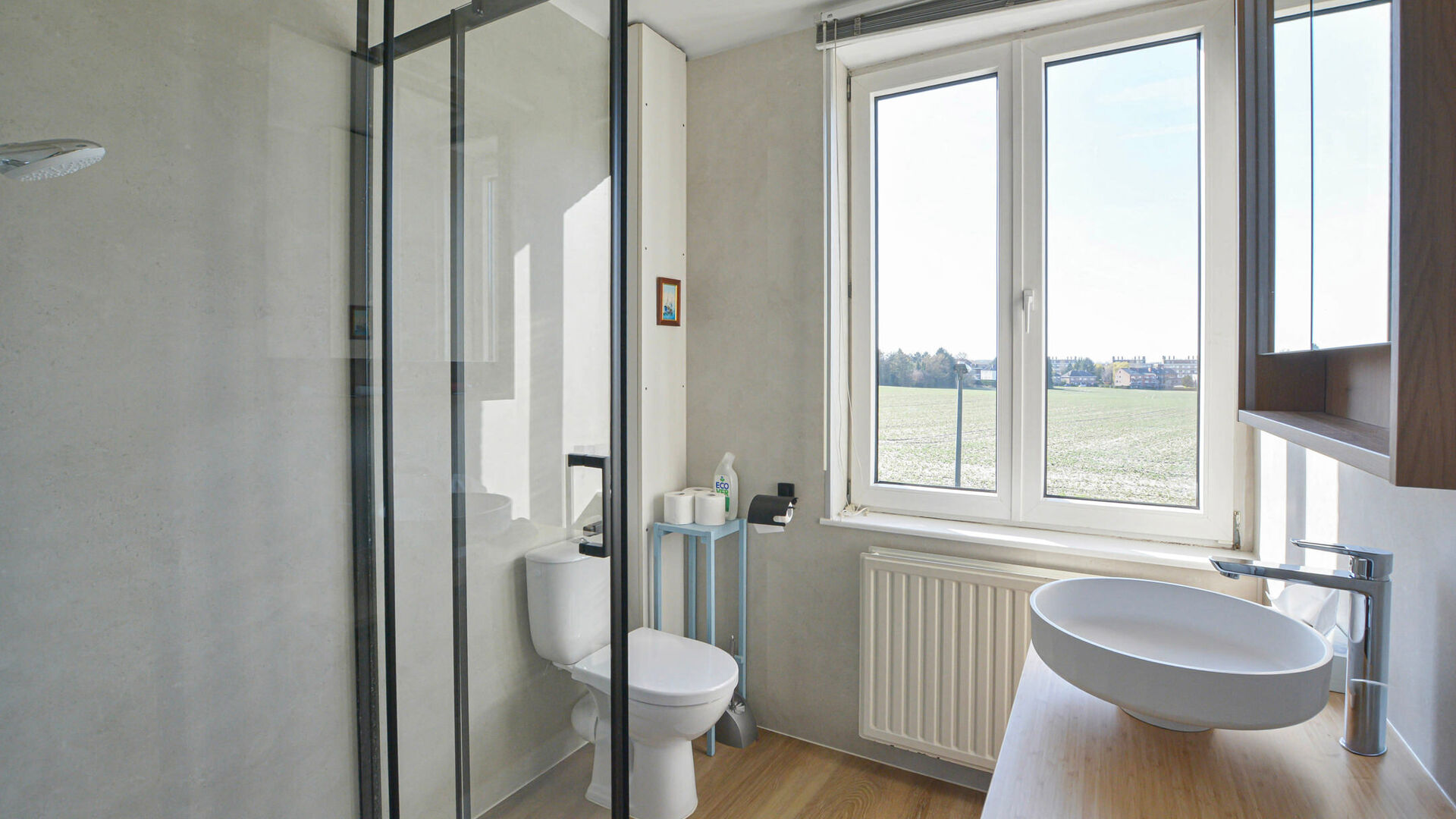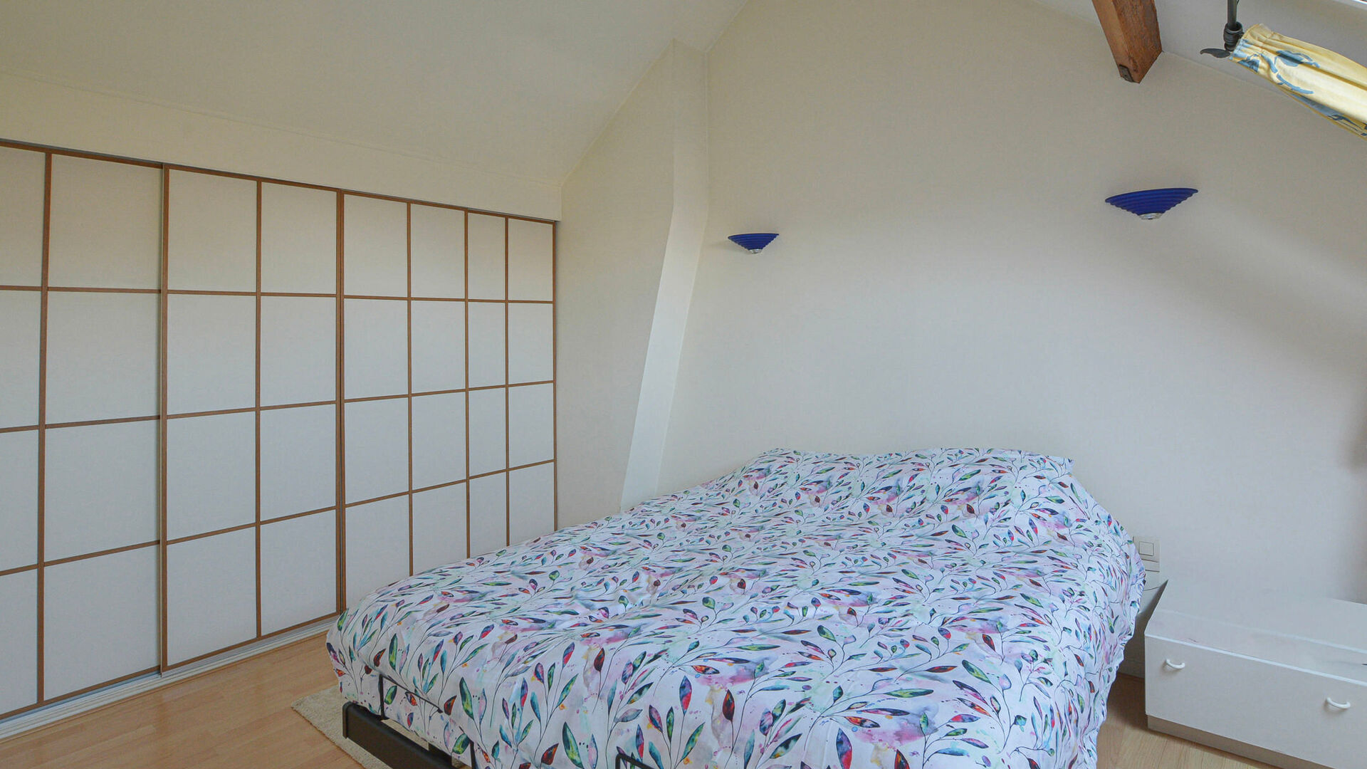 - 2e étage : Chambre à coucher de +/-15 m² avec armoire encastrée, seconde salle de bains (baignoire, toilette et lavabo) et grenier de rangement sous toiture.