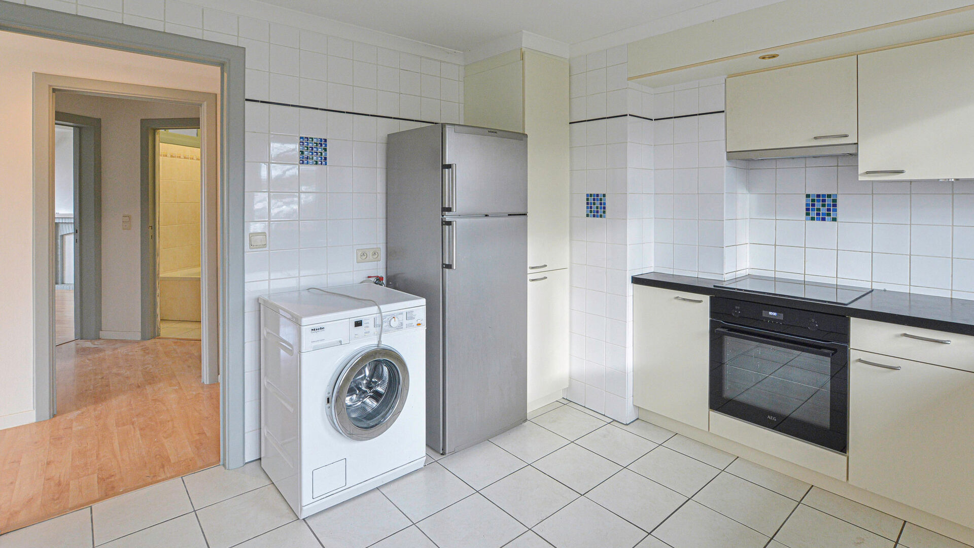 Hall d'entrée avec WC séparé // séjour +/- 14m² // cuisine super équipée +/- 12m² (frigo avec congélateur, four (neuf), lave-vaisselle (neuf), taques induction (neuf), machine à laver) avec espace déjeuner// // première chambre de +/- 15m² avec placards intégrés // seconde chambre/ bureau de +/- 9,5m² // salle de bain avec baignoire et évier // grande terrasse orienté SUD-OUEST +/- 23,5m² // cave.