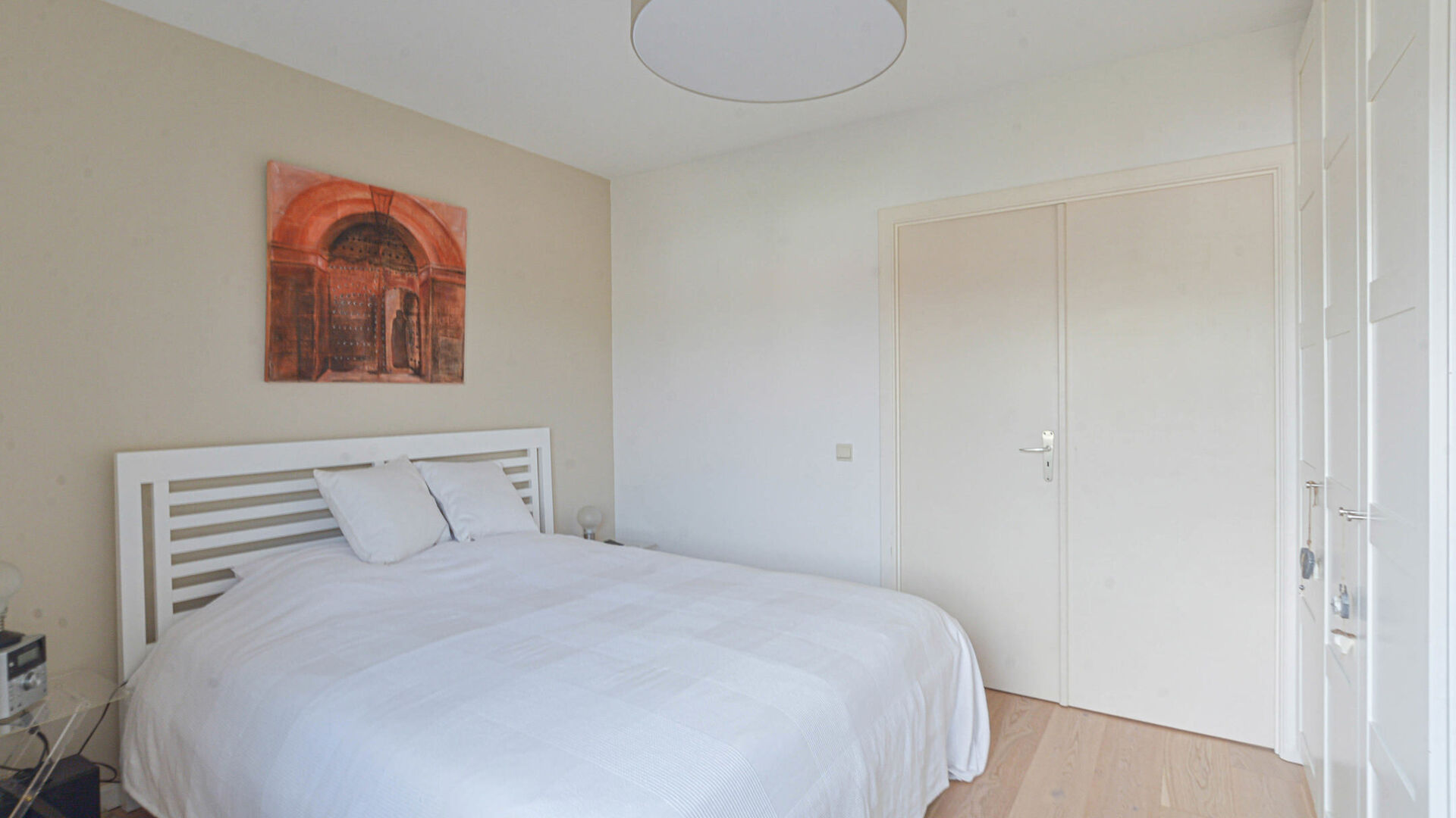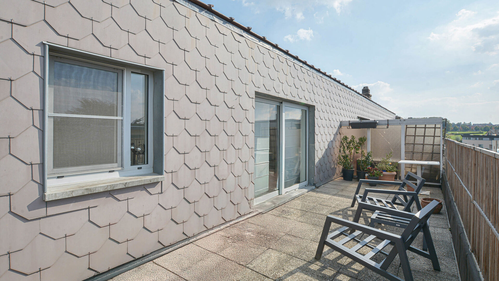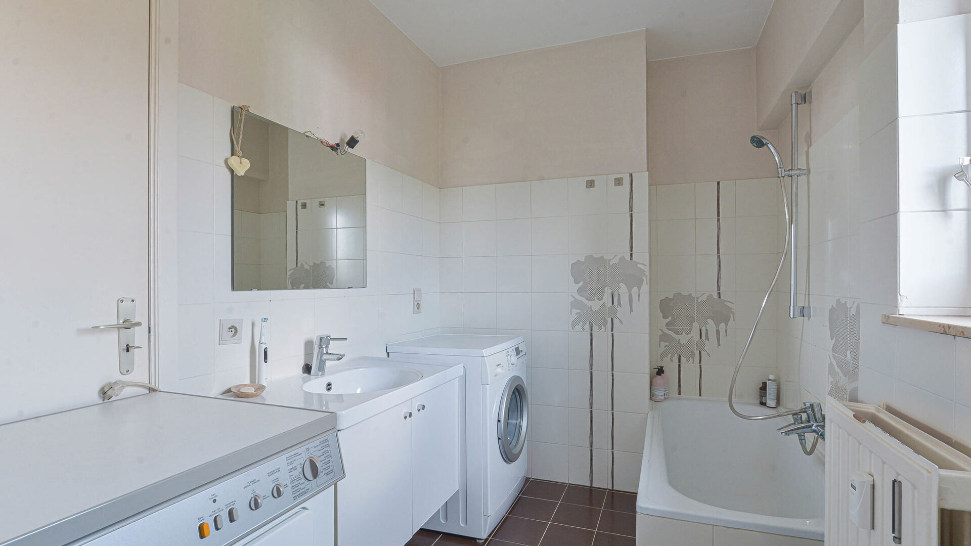 Hall d’entrée avec espace vestiaire et toilette séparée, d’une cuisine équipée (four, taques), lumineux séjour-salle à manger de ± 18 m² donnant accès à une agréable terrasse orientée Ouest. La partie nuit comprend une chambre de ± 11 m² avec salle de bains attenante, équipée d’une baignoire avec douche, évier et d’un raccordement pour machine à laver.