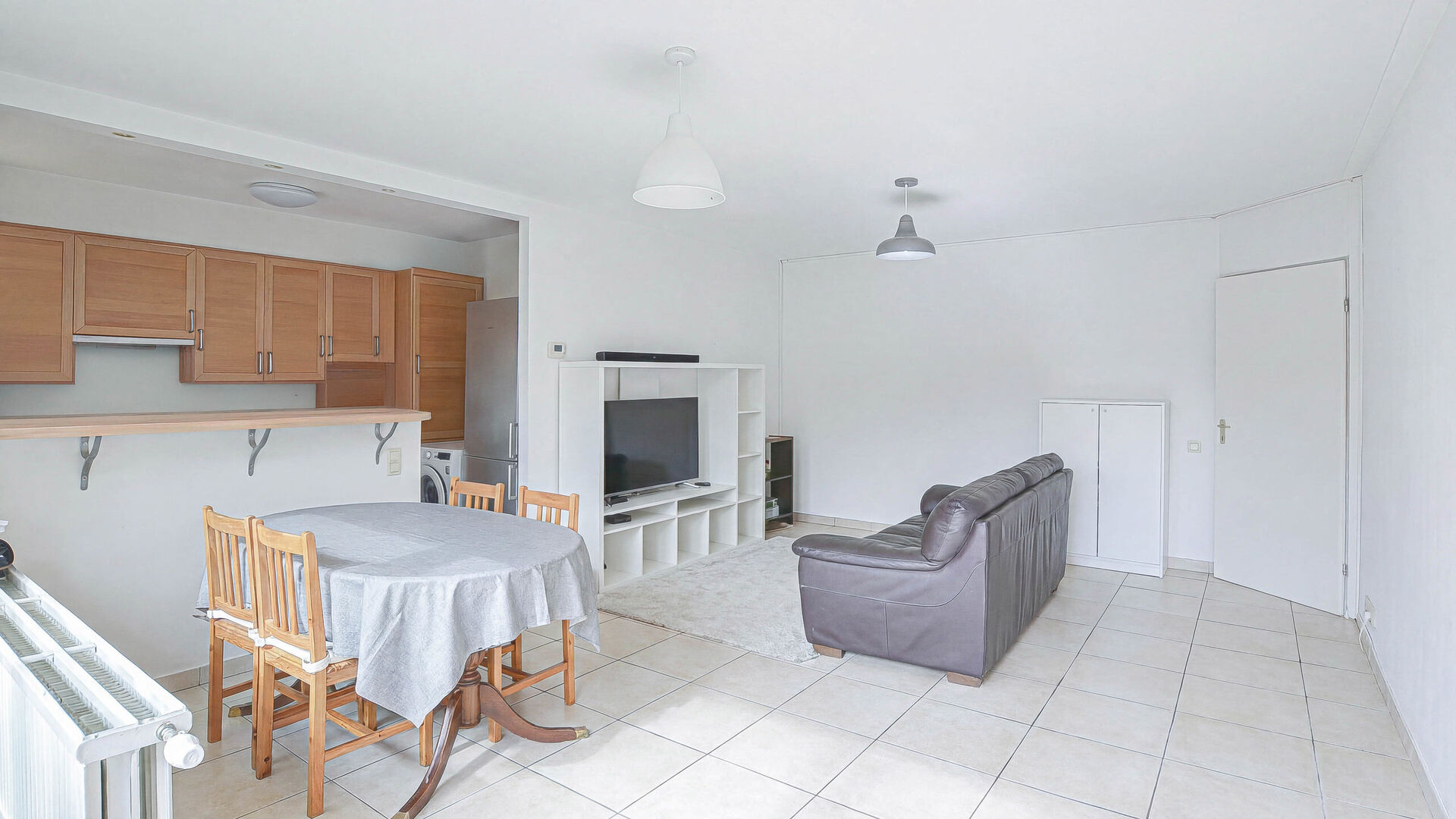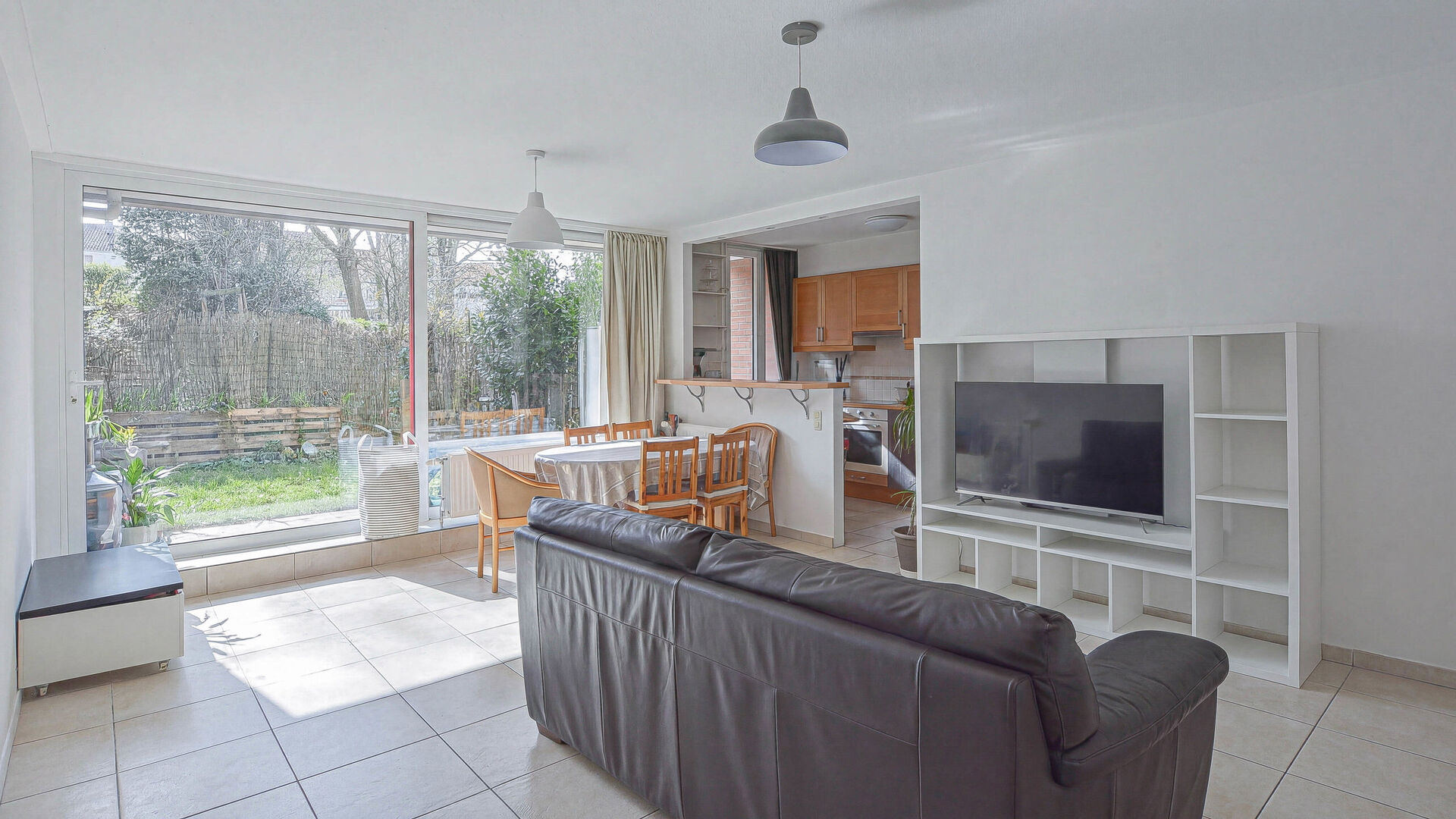 Hall d'entrée // séjour lumineux +/- 25m² donnant accès au jardin orienté SUD // cuisine équipée, ouverte +/- 6,6m² (frigo, congélateur, four, taques induction, lave-vaisselle) // hall de nuit avec WC séparé // deux chambres à coucher +/- 12m² // salle de bain avec baignoire et évier //