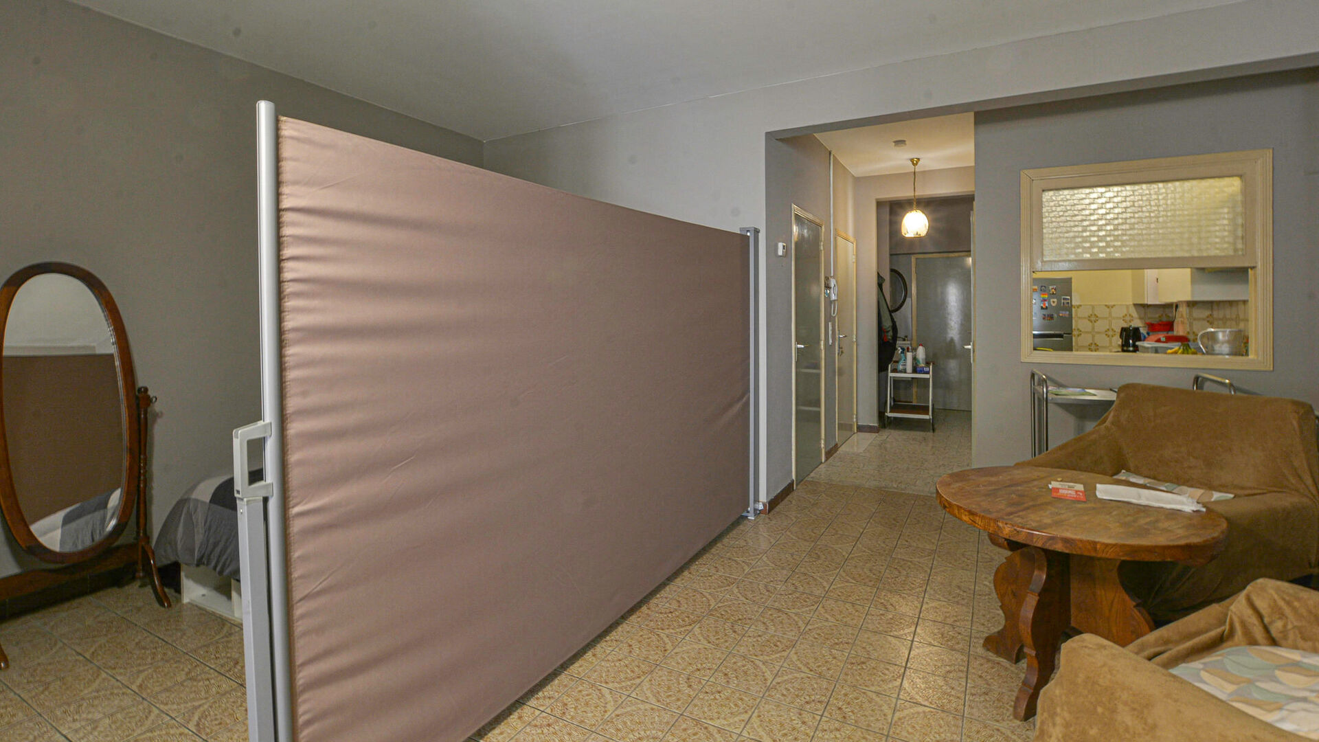 Grand séjour offrant accès au jardin avec espace couchage et espace salle à manger +/- 39m² // jardin privatif // WC séparé // cuisine équipée (taques au gaz, four, micro-ondes, lave-vaisselle, sèche linge, frigo/congelateur) // salle de douche (douche, évier, machine à laver).