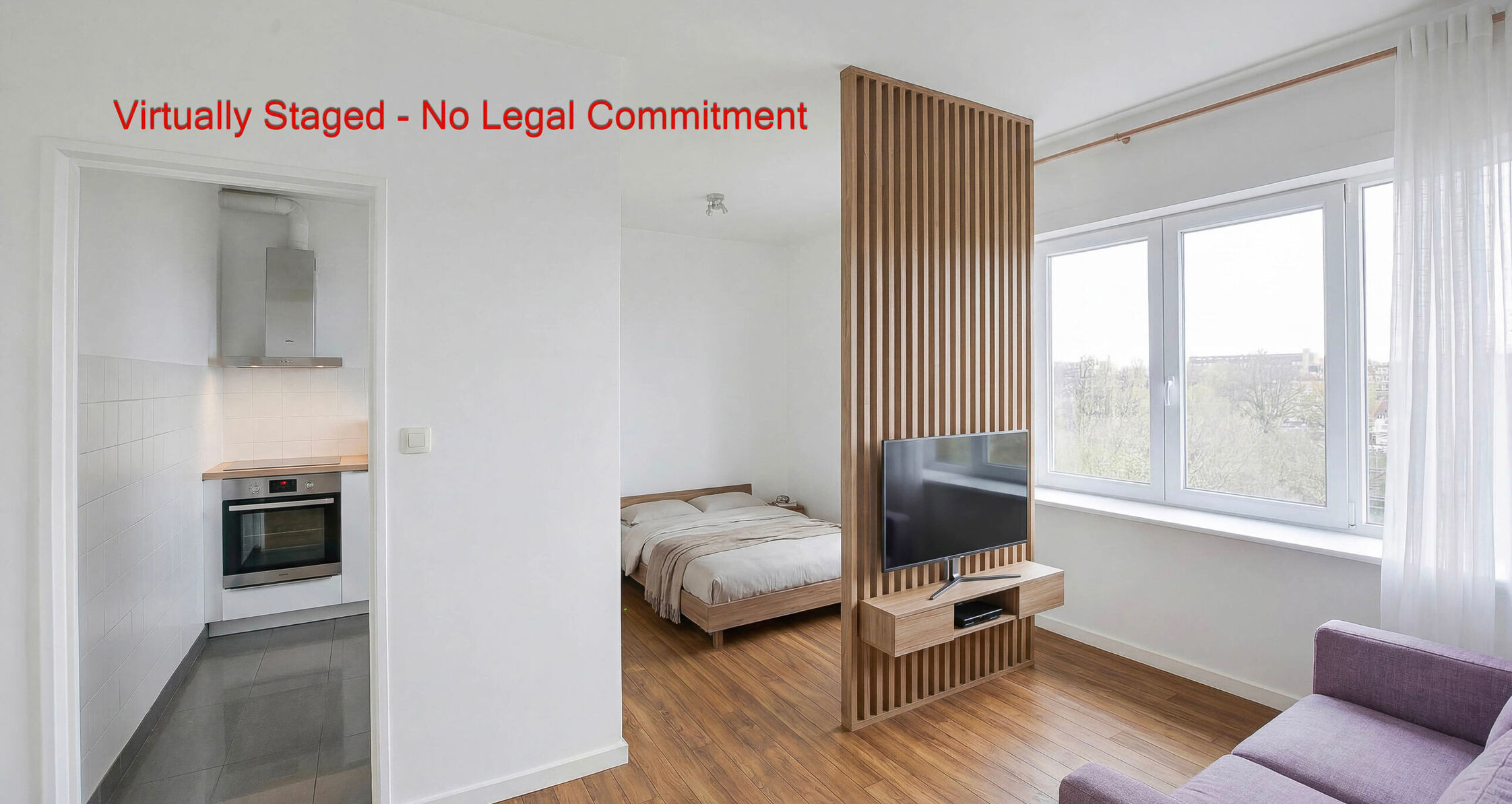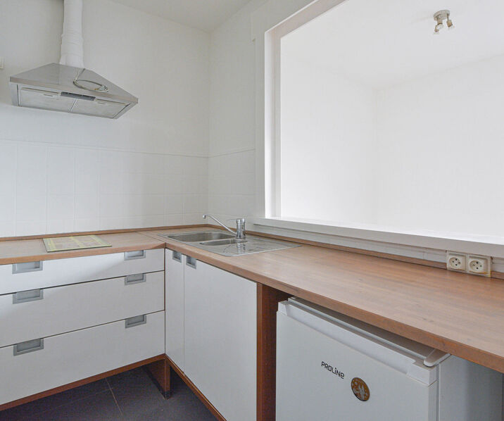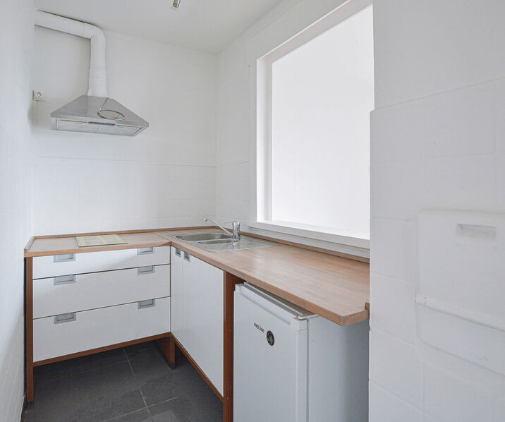 Hall d’entrée avec placard encastré, salle de bains (douche, WC, évier), cuisine équipée (taques de cuisson, frigo, hotte) et lumineux séjour/coin nuit +/-16m²