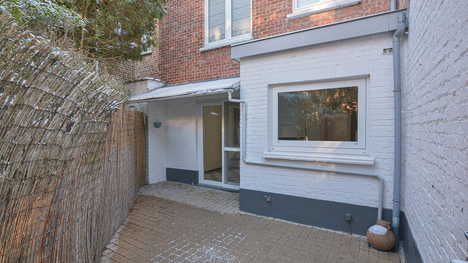 Rez-de-chaussée: Hall d'entrée avec toilette séparée, lumineux séjour-salle à manger +/- 24m² donnant accès à la cour de +/-20m², cuisine super-équipée donnant accès au sou-sol.