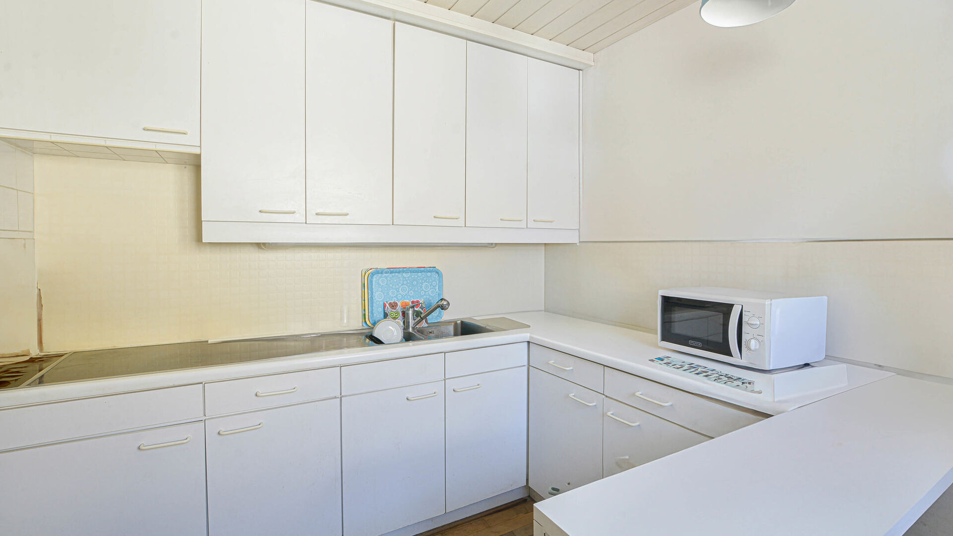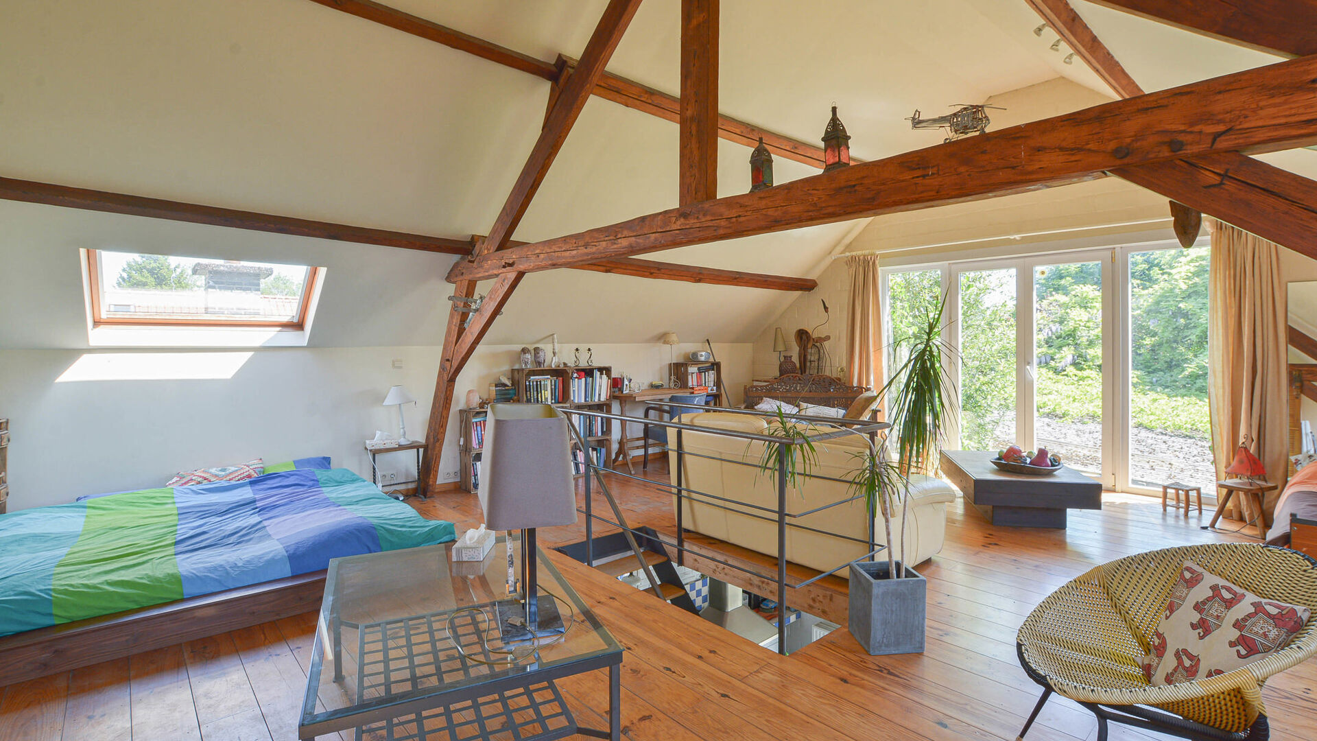 La partie droite dispose d’un espace de vie +/-27m² avec cuisine ouverte entièrement équipée, ainsi que d’une grande chambre/pièce polyvalente +/-44 m² à l'étage qui pourrait facilement être divisée en 2 chambres.