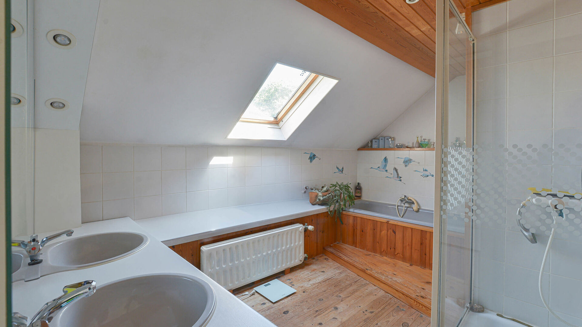 La partie gauche comprends un lumineux séjour-salle à manger +/-30m², une cuisine équipée avec accès aux caves, hall de nuit, deux chambres à coucher +/-17-11m², ainsi qu’une salle de bains avec baignoire, douche, toilette et double lavabo. La partie centrale accueille un hall d’entrée avec une salle de douche équipée d’une douche, évier et WC.