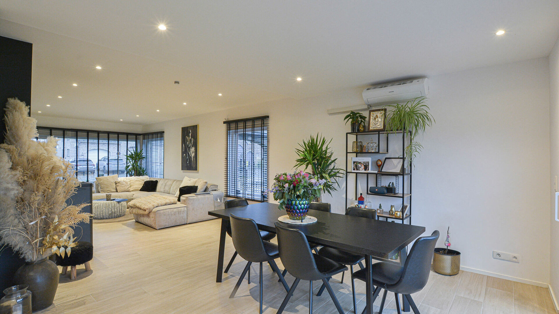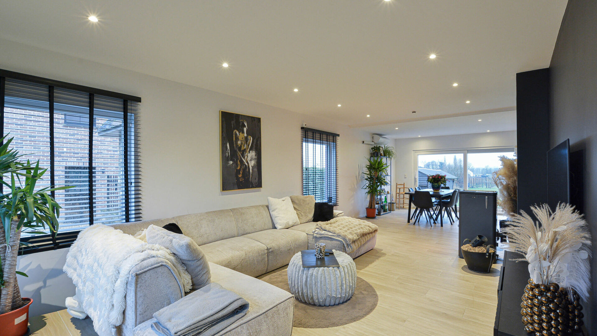 - Rez-de-chaussée: Hall d’entrée avec toilette invités et espace vestiaire, séjour-salle à manger de +/-40m², équipé d’un poêle à pellets et donnant accès à une grande terrasse orientée sud-ouest avec jardin attenant de +/- 900 m² et abri de jardin. Cuisine ouverte entièrement équipée avec îlot central. Le rez-de-chaussée comprend également un garage pour une voiture, deux emplacements de parking extérieurs, une buanderie et espace de rangement.