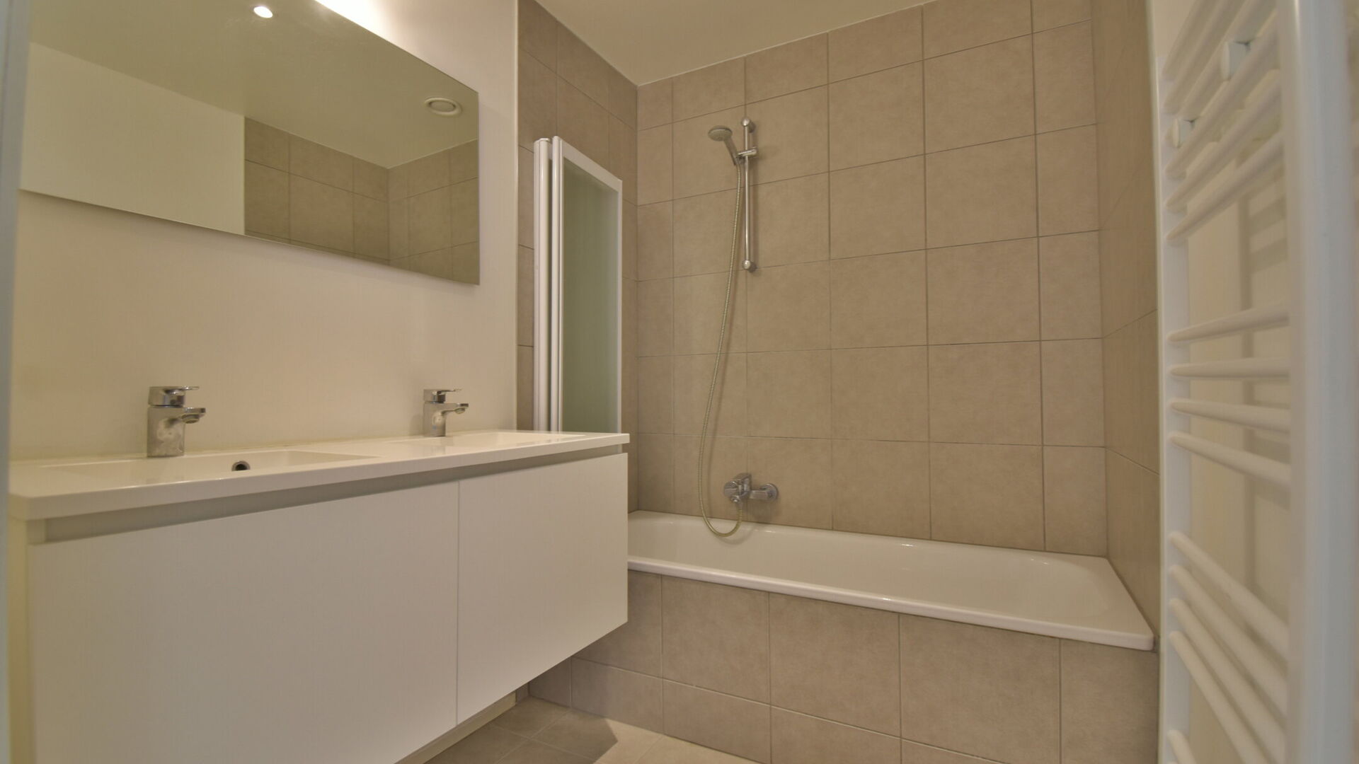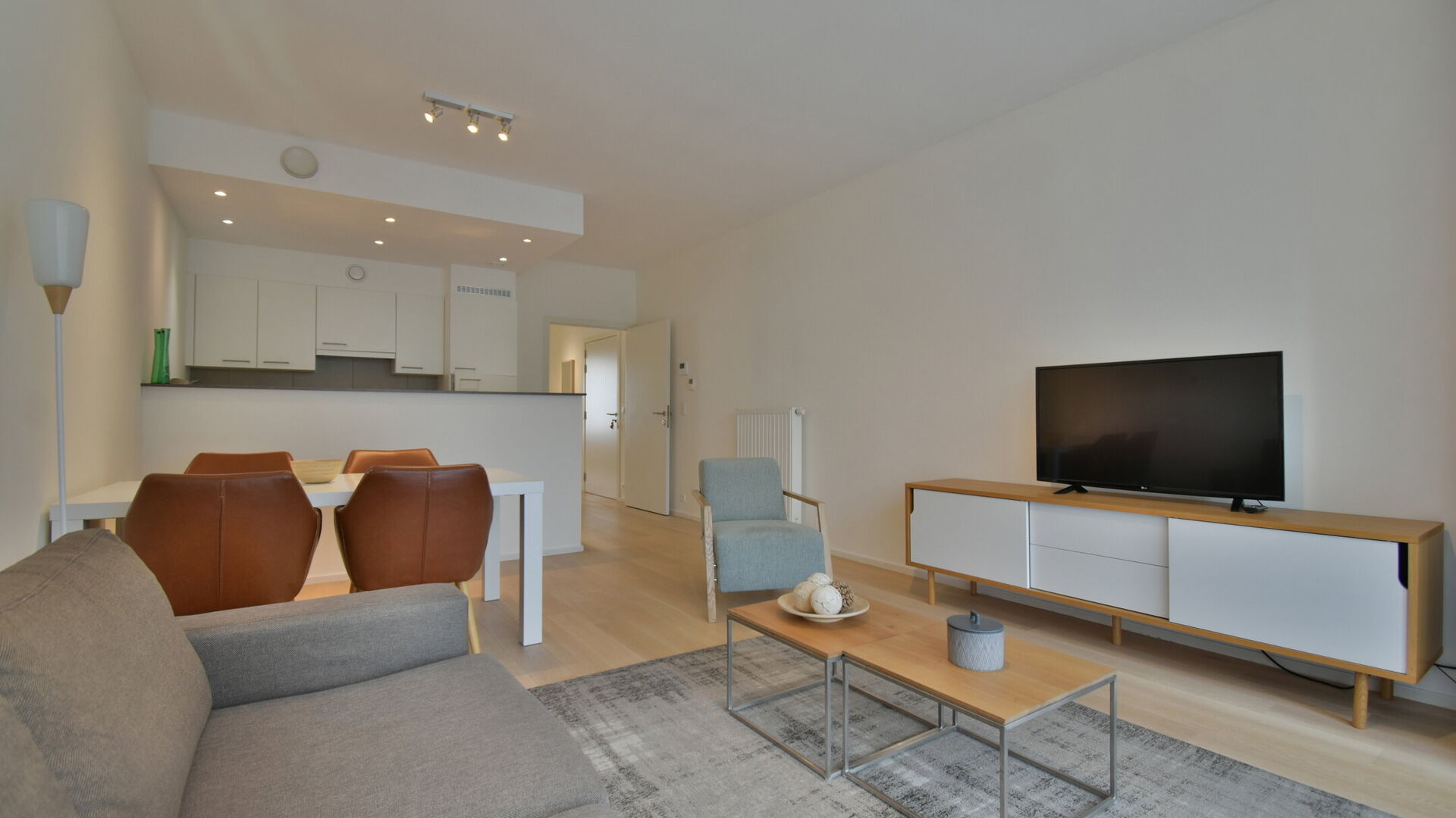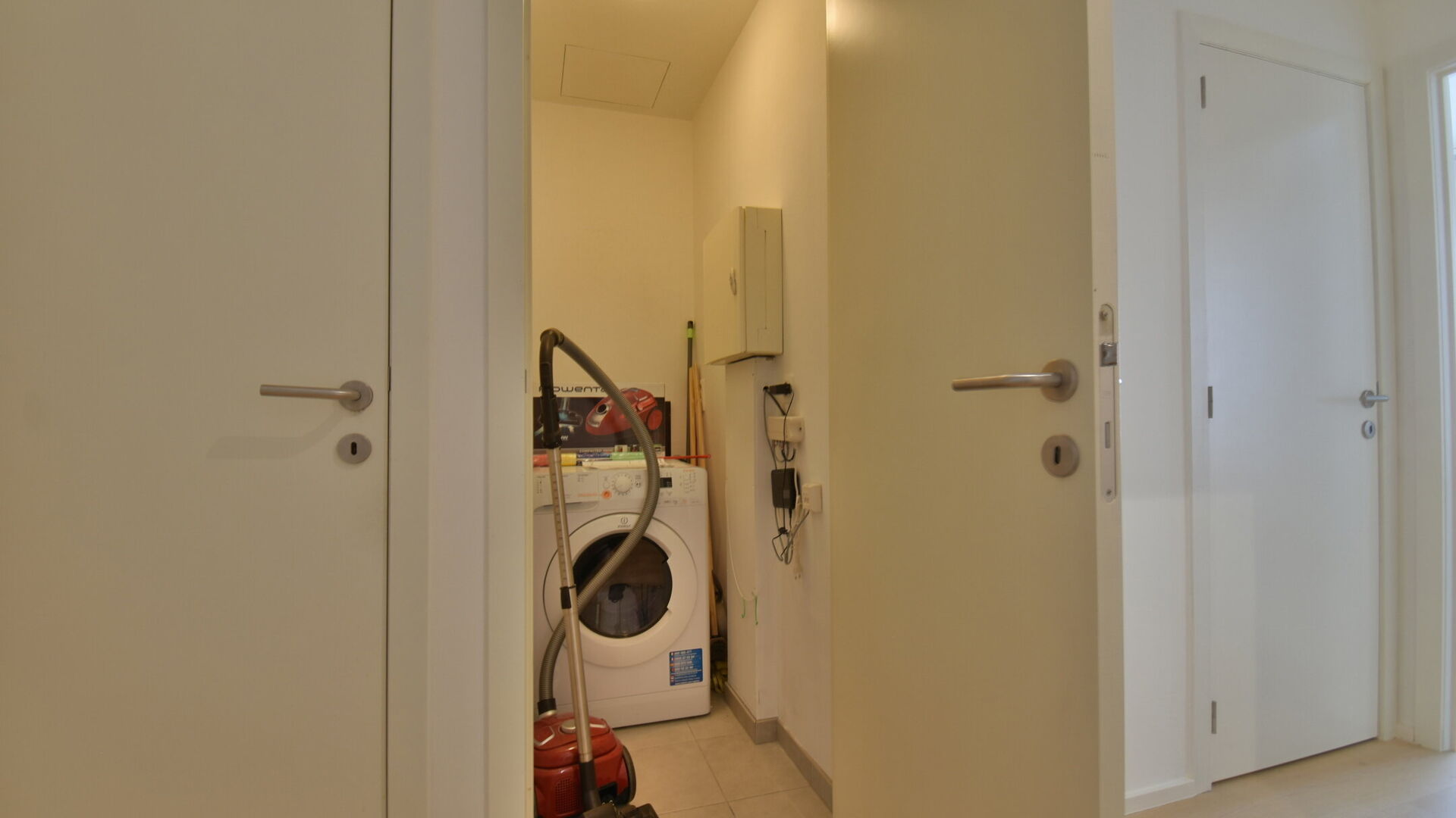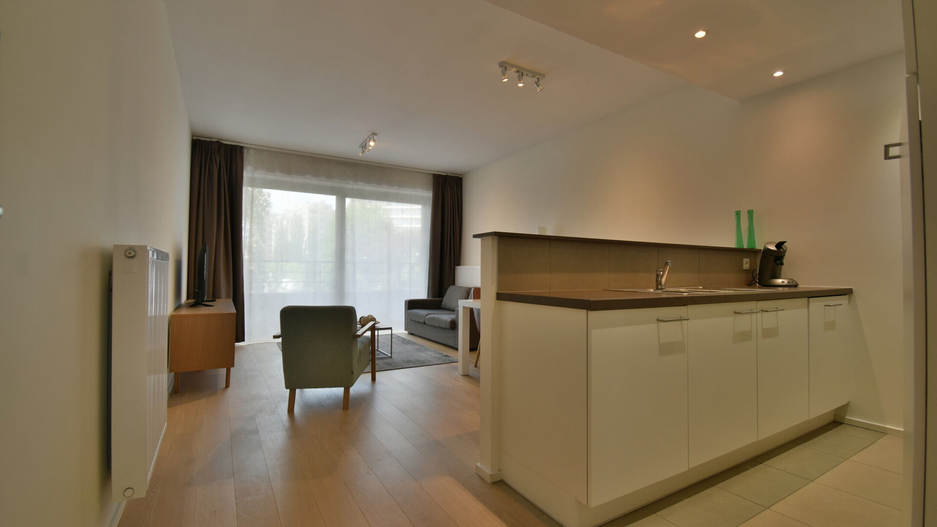 Inkomhal met apart toilet // berging // woonkamer +/- 30m² met toegang tot het zuidwestgericht terras +/- 11m² // ingerichte keuken (spoelbak, kookplaat, dampkap, vaatwasser, koelkast met vriesvak) // slaapkamer +/- 14m² // badkamer (bad met douche, dubbele wastafel).
