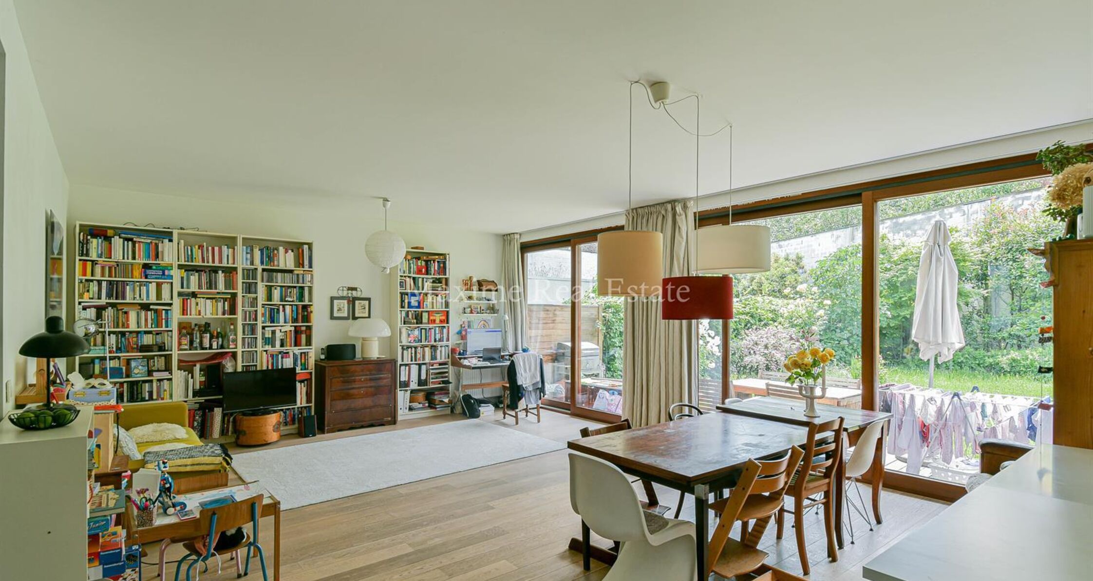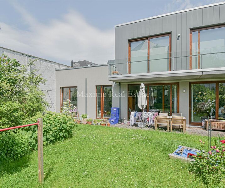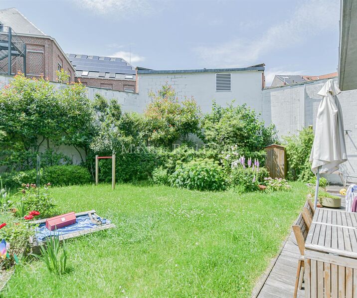 Inkomhal met WC, grote en lichte woonkamer, open keuken, wasplaats, nachthal, 2 slaapkamers (14 en 11m²), badkamer (bad, douche, dubbele wastafel), terras, grote tuin (+/- 110m²), kelder