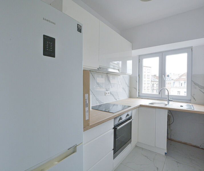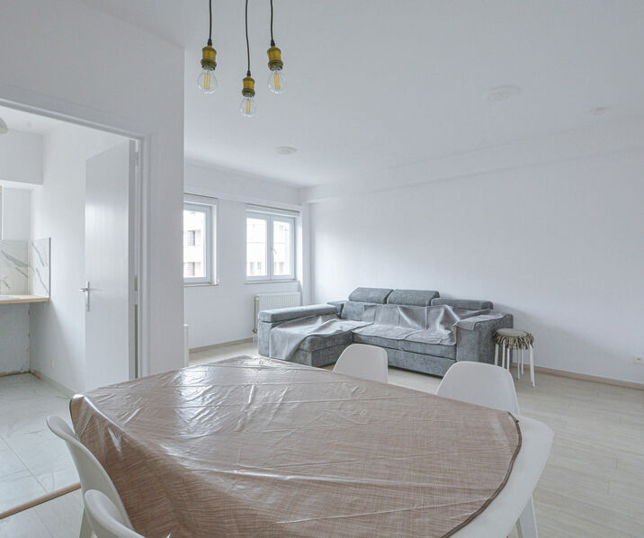 Een inkomhal leidt naar een lichtrijke leef- en eetruimte van +/-23m², een ingerichte keuken met kookplaat, oven, koelkast-diepvriezer en aansluiting voor een wasmachine. De nachthal geeft toegang tot een apart toilet, een bergruimte, een slaapkamer van +/-15 m², en een nieuwe badkamer uitgerust met een inloopdouche en een lavabo. Extra informatie: dubbele beglazing, individuele gasketel, lasten van 70€/maand (onderhoud gemeenschappelijke delen), parlofoon, beveiligde deur. Het appartement is onmiddellijk beschikbaar.
