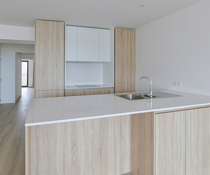 Inkom, gastentoilet, lichtvolle woon-eetkamer +/-28m², volledig uitegeruste open keuken (kookplaat, oven, micro-golfoven, vaatwasser) met centraal kookeiland en ontbijthoek. 2 slaapkamers +/-12-10 waarvan de kleinste toegang geeft tot het terras, badkamer met alle comfort (ligbad, inloopdouche, dubbele wastafel en toilet).