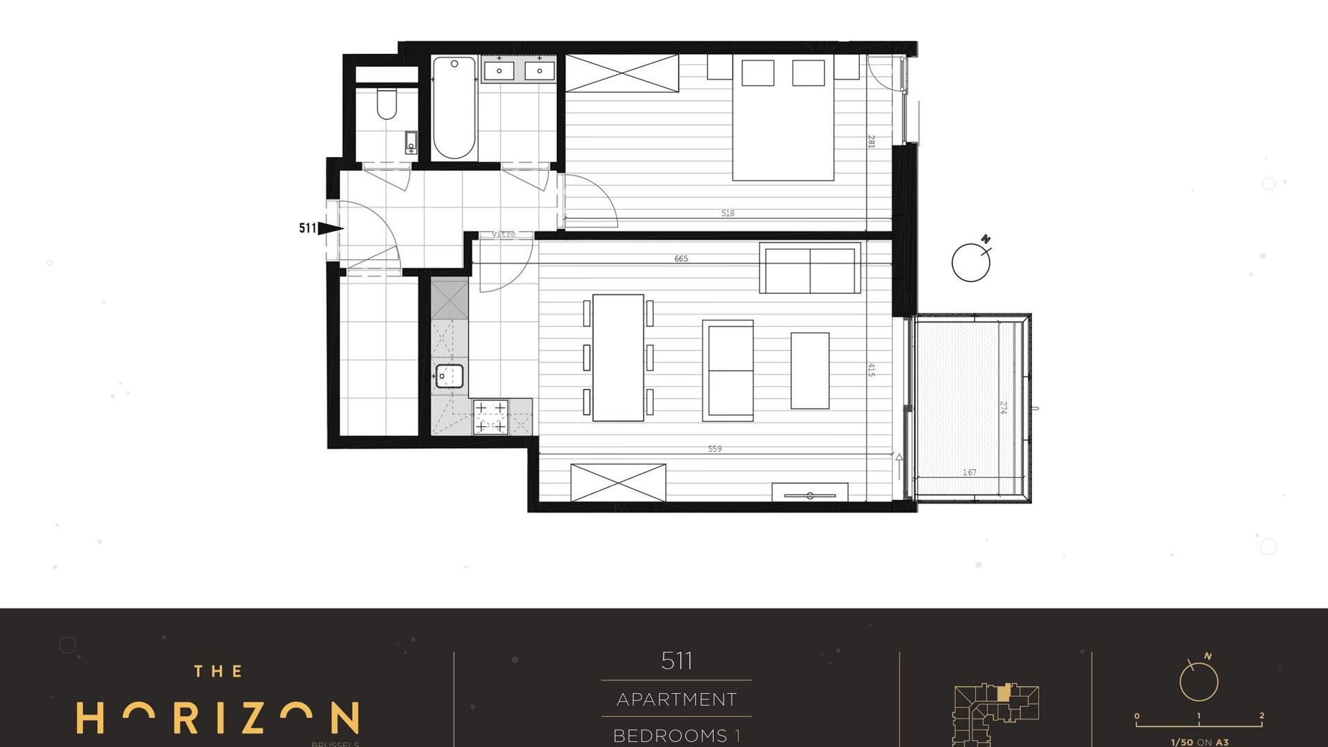Het bestaat als volgt: Hal, apart toilet, woonkamer met toegang tot het terras, super uitgeruste open keuken (keramische kookplaat, oven, koelkast, vaatwasser), 1 slaapkamer, badkamer en terras.