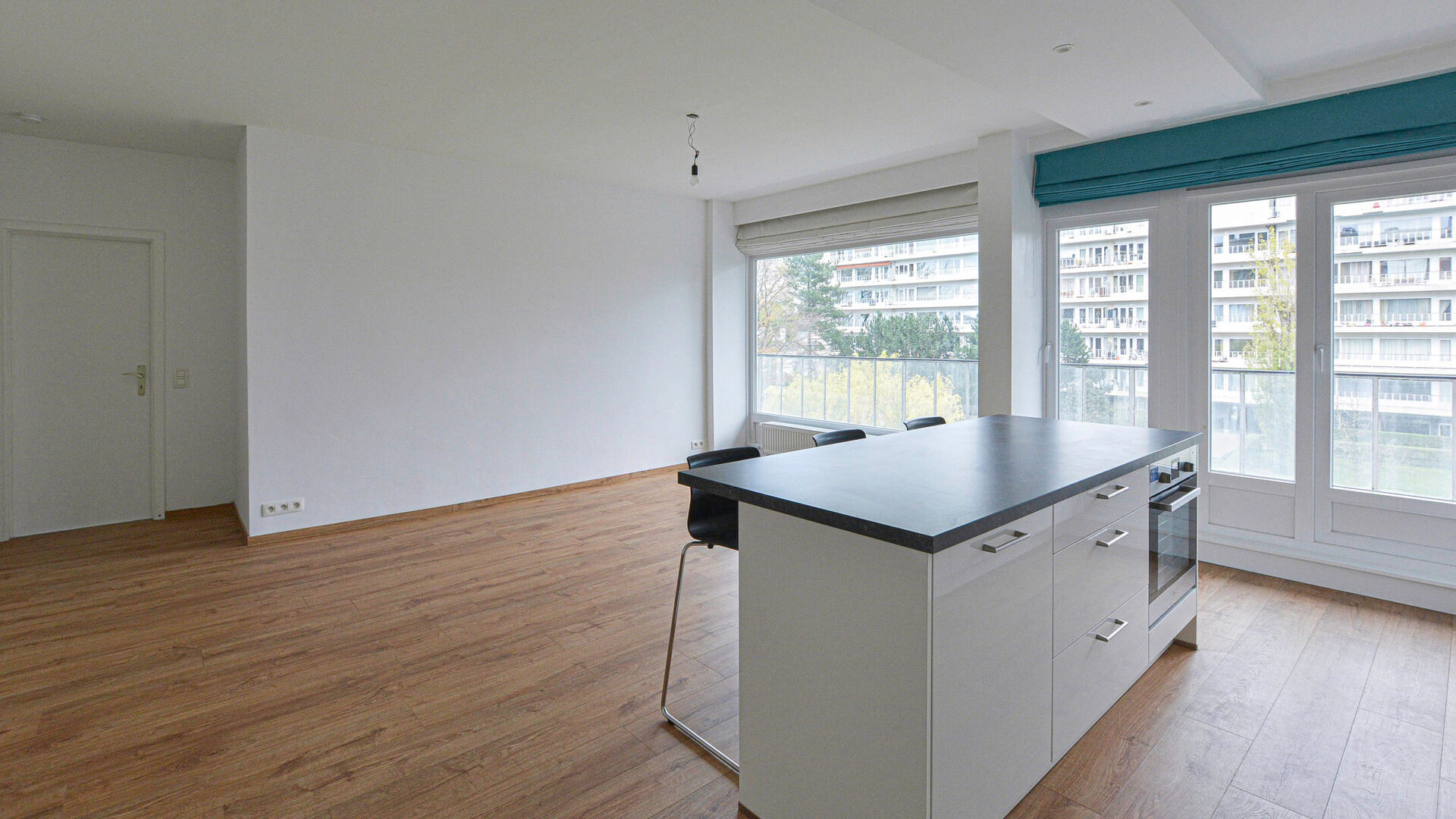 Een lichte woonkamer van +/-19 m² met open keuken en centraal eiland, volledig uitgerust (koelkast, diepvries, oven, vaatwasser, inductiekookplaten) // oostgericht terras van +/- 16m², dat langs de volledige lengte van het appartement loopt // nachthal met aparte WC // 2 slaapkamers van +/-12 m² en 11,7 m² // doucheruimte met inloopdouche, wastafel en aansluiting voor wasmachine // privatieve kelder