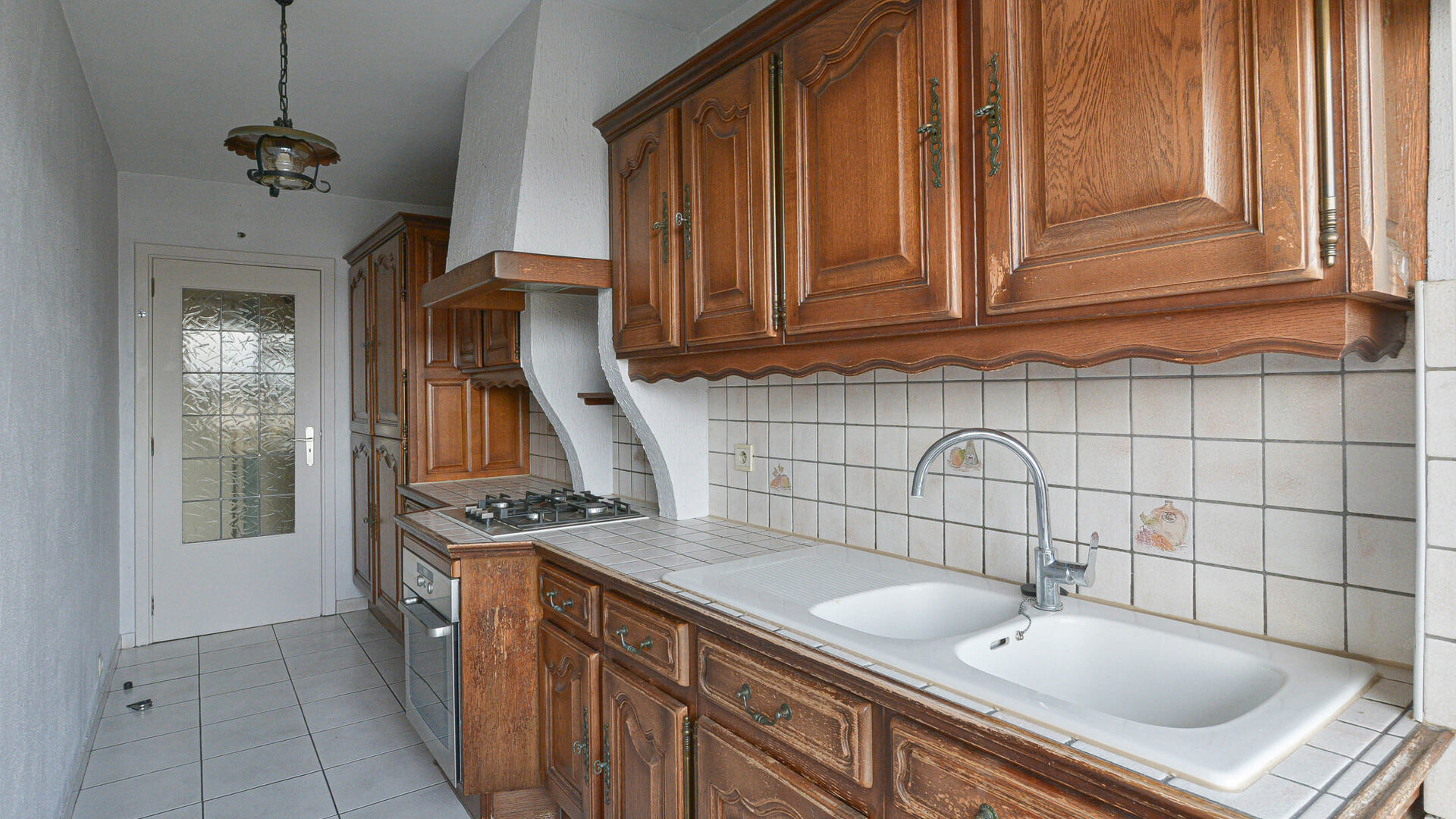 Inkomhal met kasten en vestiaire // lichte woonkamer van +/- 30m² met toegang tot het terras op het oosten // aparte keuken // nachthal met apart toilet // 2 slaapkamers van +/- 12,8-9,2m², waarvan de grootste toegang heeft tot het terras // badkamer met bad en lavabo // een kelder // een binnen staanplaats/garage.