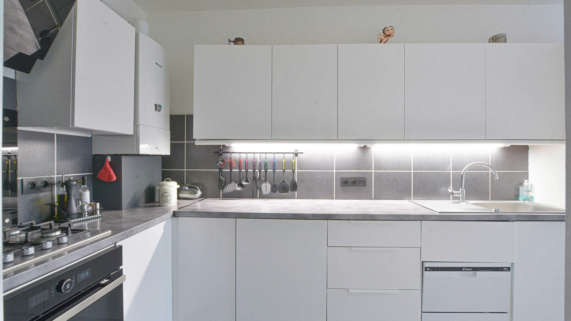 - Volledig ingerichte keuken met aansluitingen voor wasmachine en droogkast,