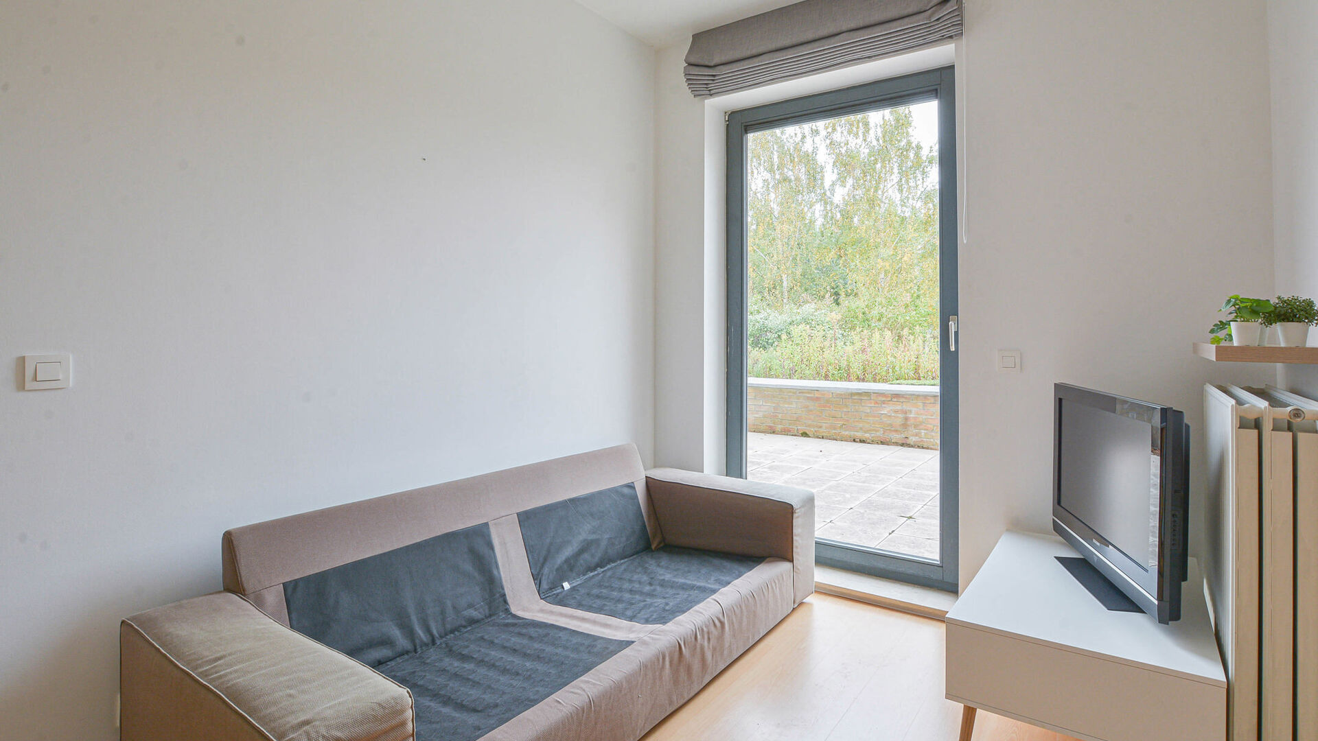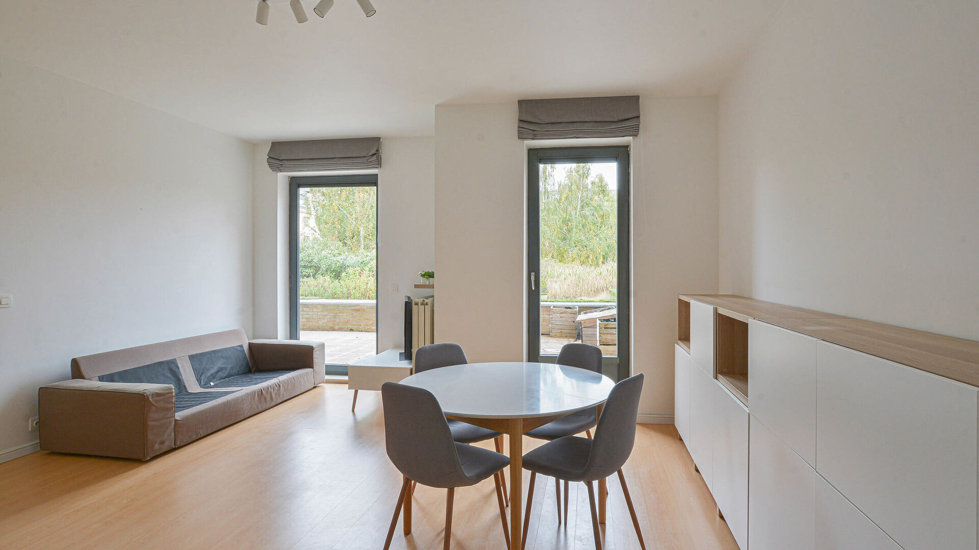 Inkomhal met ingebouwde vestiairekast en toilet, badkamer met ligbad en wastafel. De lichtrijke woon- en eetkamer van +/-21m² geeft toegang tot een ruim terras, volledig uitgeruste keuken met berging/technische ruimte en slaapkamer van +/-14m².