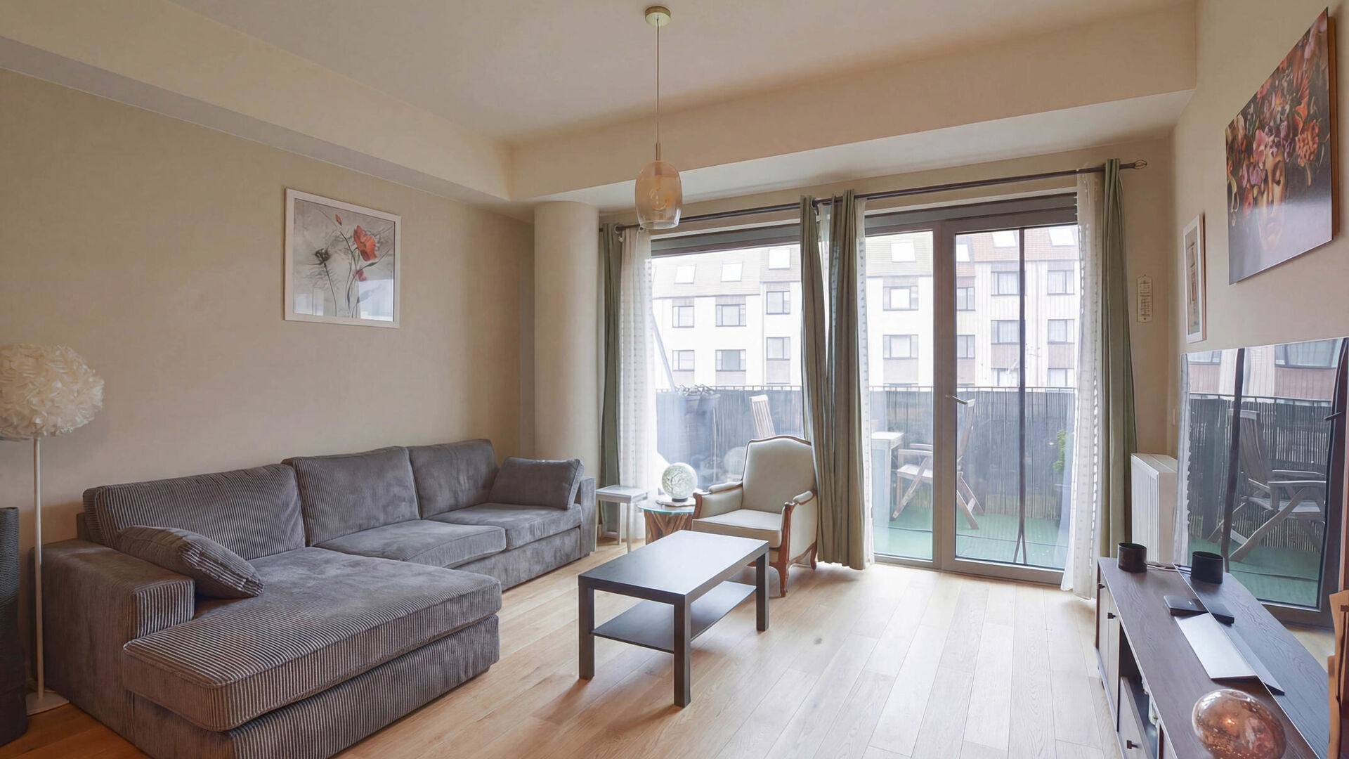 Dit mooie appartement van ongeveer 68 m² (volgens EPC), volledig gelegen aan de achterzijde van het gebouw, bestaat uit een inkomhal, een apart toilet, een wasruimte, een volledig uitgeruste open keuken met ontbijthoek, en een lichtrijke leefruimte met toegang tot een aangenaam zuidgericht terras van ongeveer 8 m².