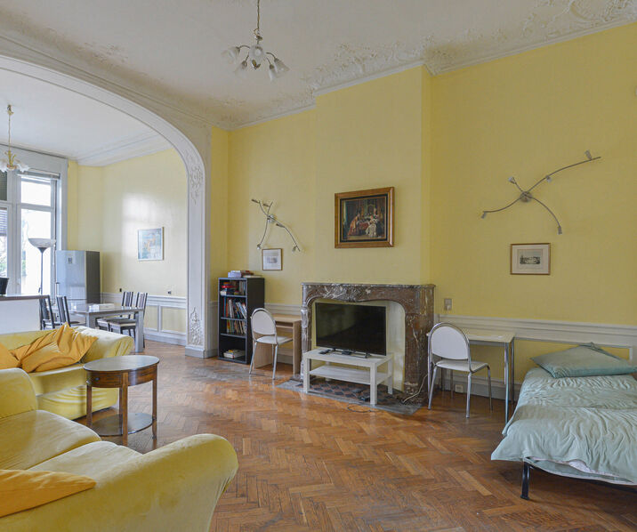Deze herenwoning in Beaux-Artsstijl, met een oppervlakte van +/- 580 m², is officieel erkend als eengezinswoning, maar is momenteel ingericht als 7 woonentiteiten, waarvan het merendeel wordt uitgebaat als korte termijnverhuur en is als volgt ingedeeld: