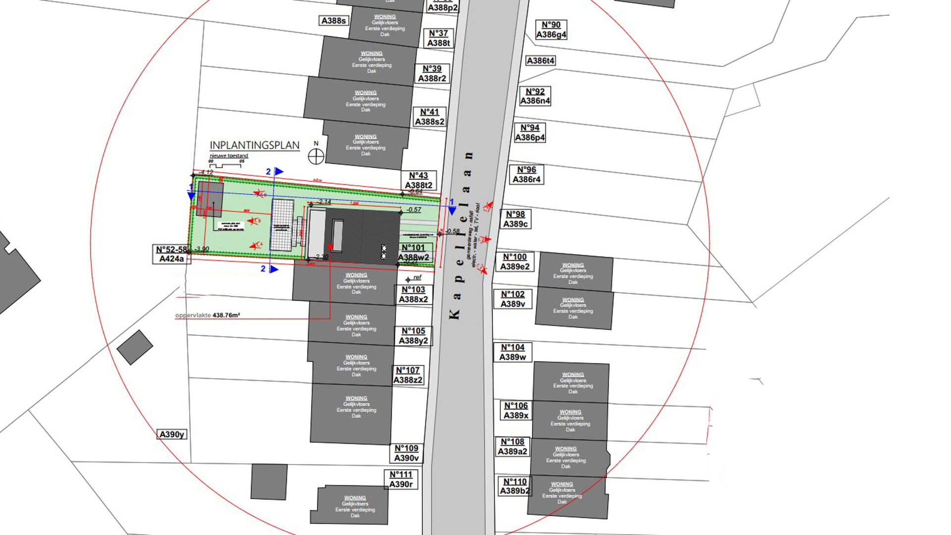 Dit perceel grond heeft een oppervlakte van 4a83ca en heeft de volgende afmetingen: 12m breedte en 40m diepte.