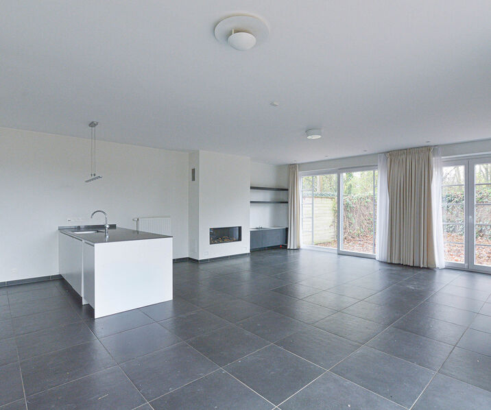 Gelijkvloers: inkomhal met gastentoilet en ingebouwde vestiairekast, lichtrijke woonkamer – eetkamer van ± 40 m² met open haard en toegang tot een westgericht tuin met terras en tuinhuis, prachtige volledig uitgeruste keuken van ca. 10 m² met centraal eiland, en een garage voor één wagen plus een buitenstaanplaats op de oprit.