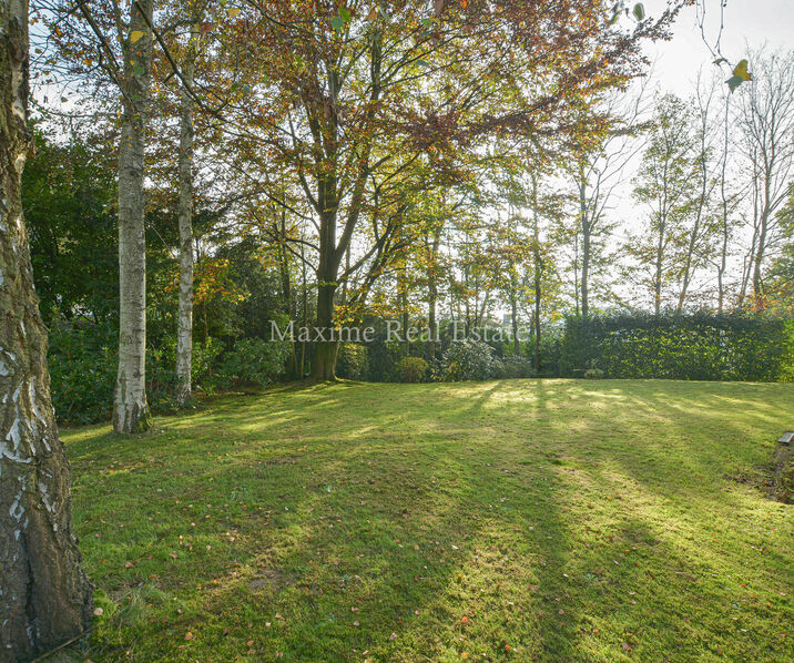 Gelijkvloers: ruime inkomhal met gastentoilet en geïntegreerde vestiaire, lichtrijke woon-eetkamer +/-57m² met open haard en toegang gevend tot een open terras en prachtige ZUIDgerichte tuin met adembenemend zicht op het bos.
