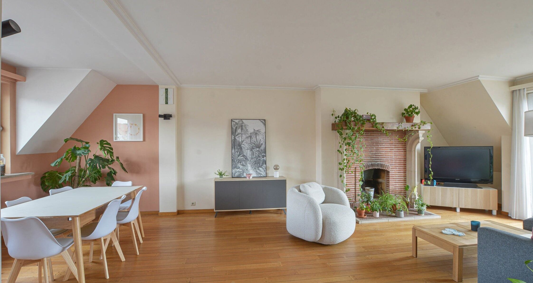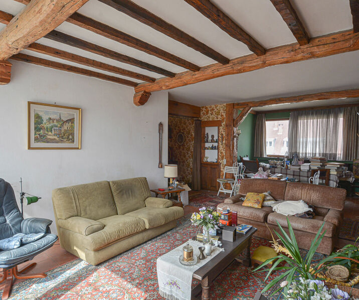Dit charmant duplex appartement van +/-108m² (volgens EPC) heeft een grondige renovatie nodig. Gelegen op de laatste verdieping, is het als volgt ingedeeld: