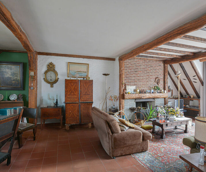 Inkomhal met vestiaire en toilet, lichtrijke woon- en eetkamer van +/- 35 m² met sierschouw en toegang tot het zuidgericht terras van +/- 10 m² met vrij uitzicht over de omliggende tuinen. Ingerichte keuken (kookplaat, oven, koelkast/diepvriezer) met ontbijthoek, eerste slaapkamer van +/- 9 m² met ingebouwde kast, badkamer met ligbad en wastafel. Op de verdieping: bureauruimte en hoofdslaapkamer van +/- 16 m².