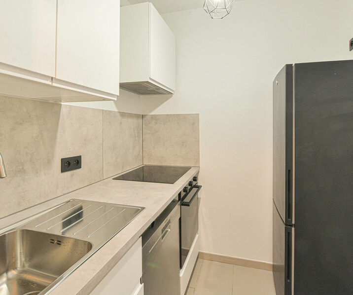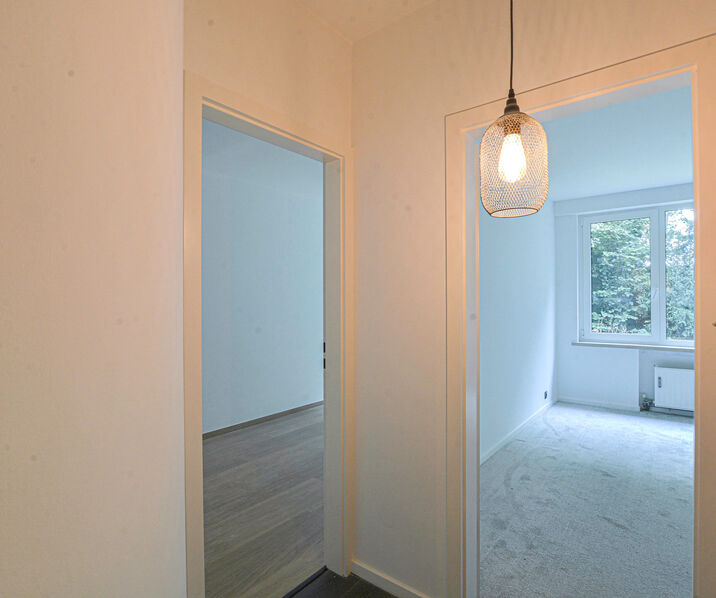Inkomhal // apart toilet // woonkamer +/- 20m² met toegang tot het zuidwestelijk gelegen terras +/- 12m² // volledig uitgeruste keuken (koelkast, vriezer, oven, inductiekookplaat, vaatwasser) // 2 slaapkamers +/- 14,5m² en 11m² // douchekamer (douche en lavabo) // kelder met aansluiting voor wasmachine.