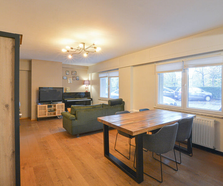 Dit mooie appartement +/-88m² (volgens EPC) bevindt zich op het gelijkvloers van een goed onderhouden mede-eigendom en is als volgt ingedeeld: