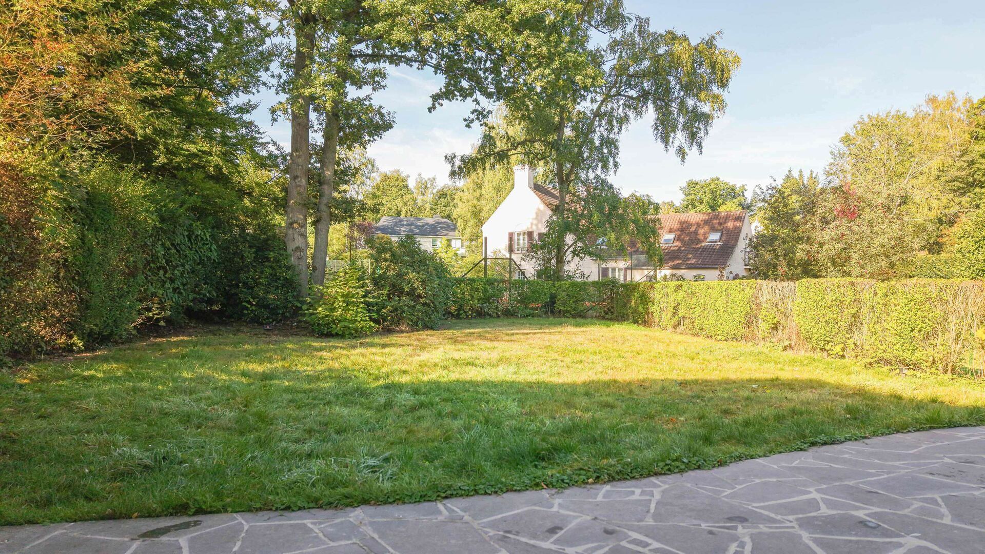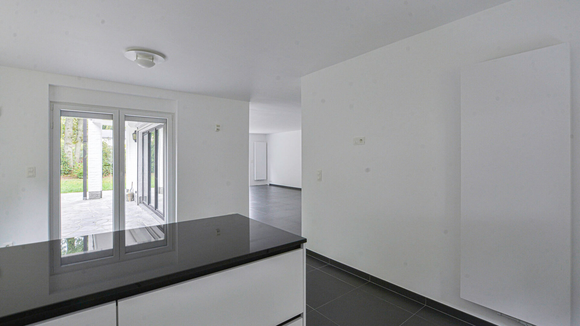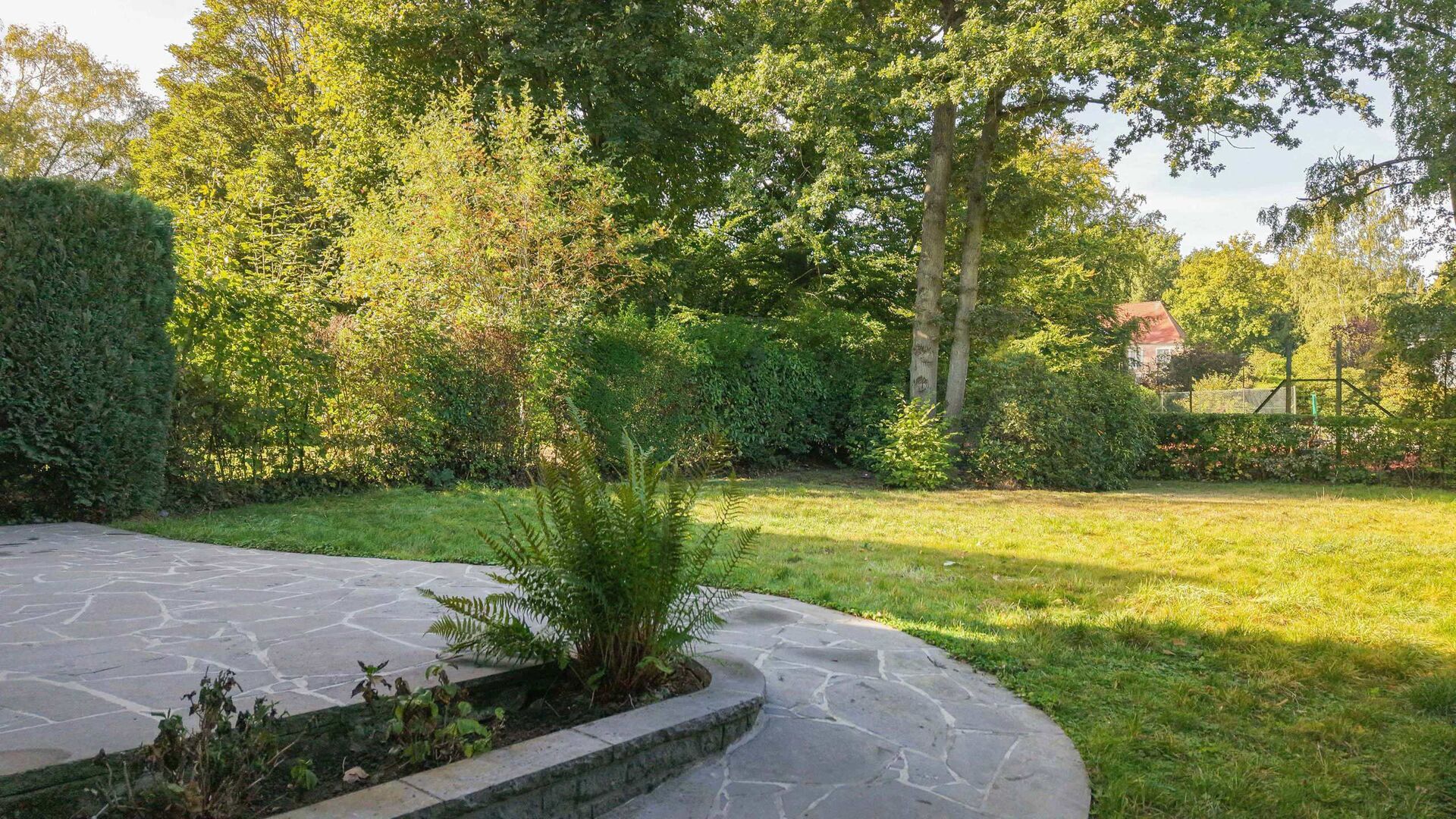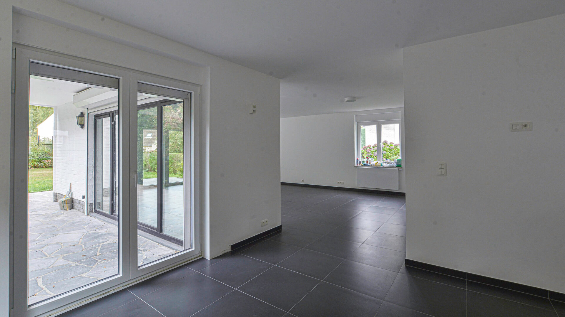 Inkomhal met vestiaire en apart toilet // lichtrijke woonkamer van ca. 45 m² met open haard en toegang tot de zuidgerichte tuin // gloednieuwe volledig ingerichte keuken met ontbijthoek (koelkast/diepvries, oven, microgolf, vaatwasser, inductiekookplaat, dampkap, …). Verdieping: