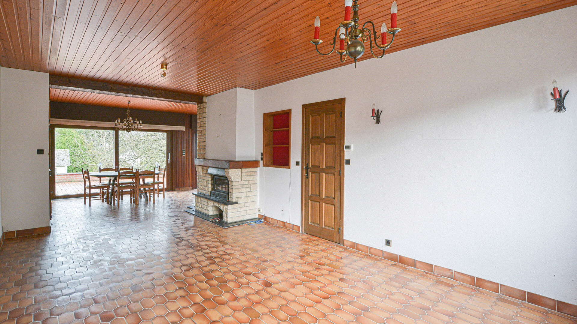 Gelijkvloers: Inkomhal met gastentoilet, ruime en lichtrijke leefruimte van ± 46 m² met open haard, gezellige eetkamer met open keuken van ± 7 m². De leefruimtes geven toegang tot een groot terras van ± 50 m², met een open uitzicht op de tuin. Eerste verdieping: Nachthal die toegang biedt tot drie slaapkamers en een badkamer met toilet. Inrichtbare zolder: Ongeveer 25 m², met interessante uitbreidingsmogelijkheden. Kelderverdieping: Meerdere kelders, stookruimte en een grote garage voor maximaal drie wagens, met garagedeur en met rechtstreekse toegang tot de tuin. Troeven: