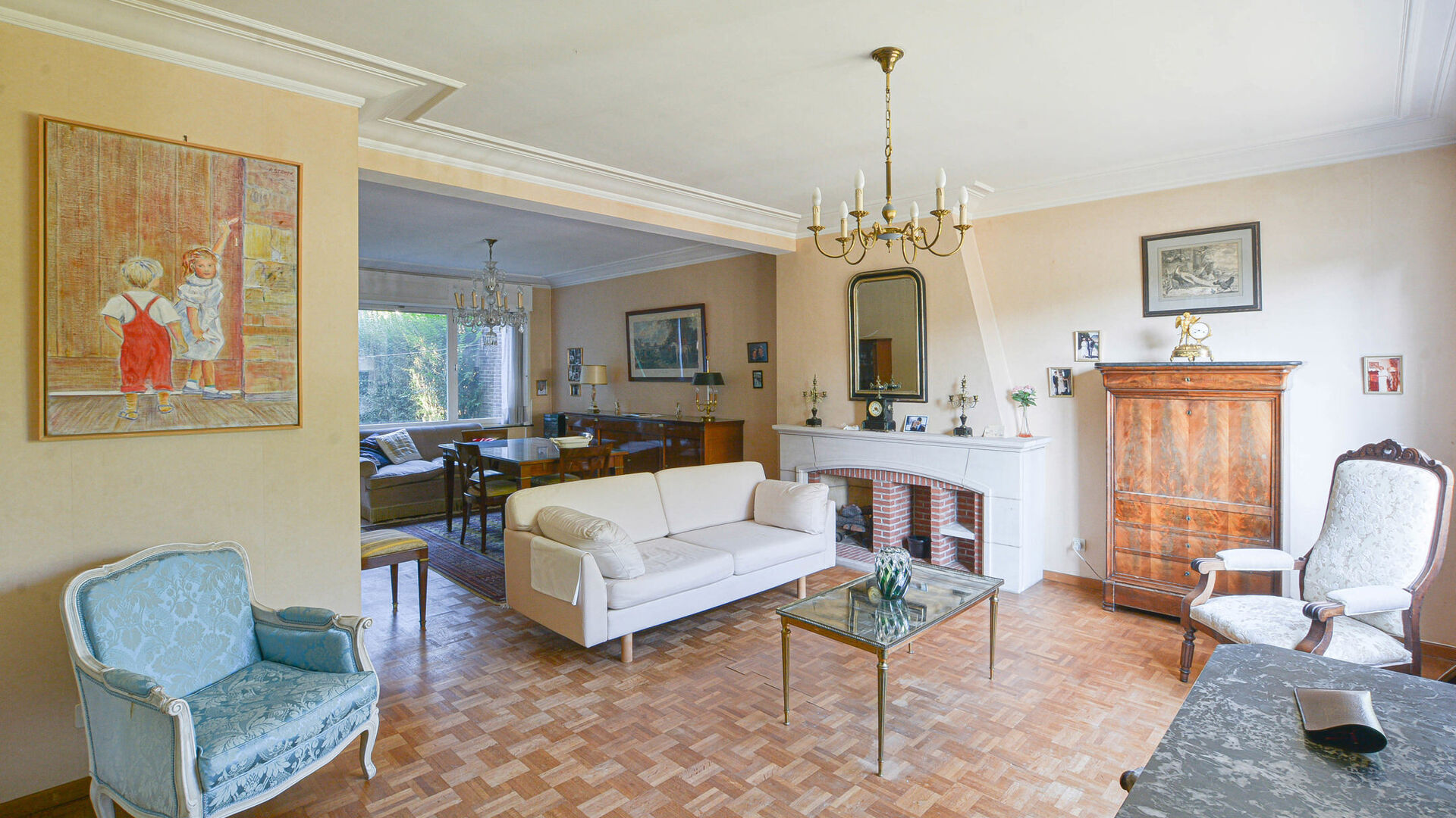 Gelijkvloers: inkomhal met vestiairehoek en apart toilet, leefruimte–eetkamer van ±35 m² met open haard, ingerichte keuken met toegang tot het terras en de tuin.