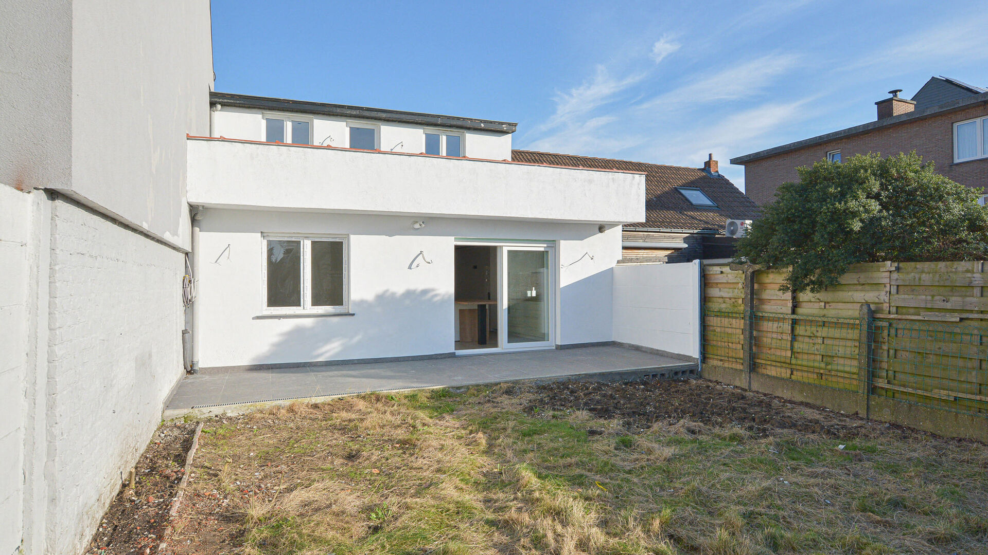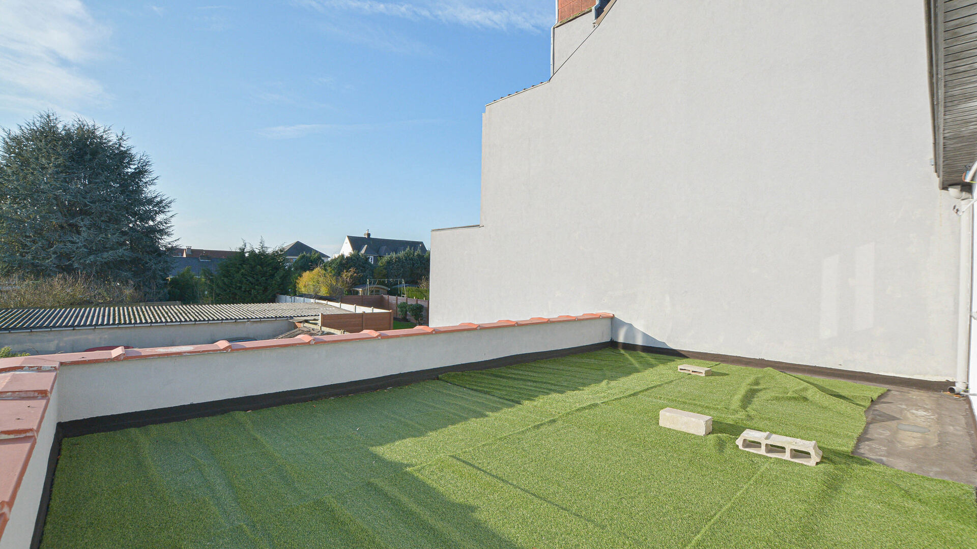 - 1e verdieping: nachthal met apart toilet, twee slaapkamers van +/-19 m² en +/-11 m². Tevens is er toegang tot een plat dak dat kan gebruikt worden als ruim dakterras.