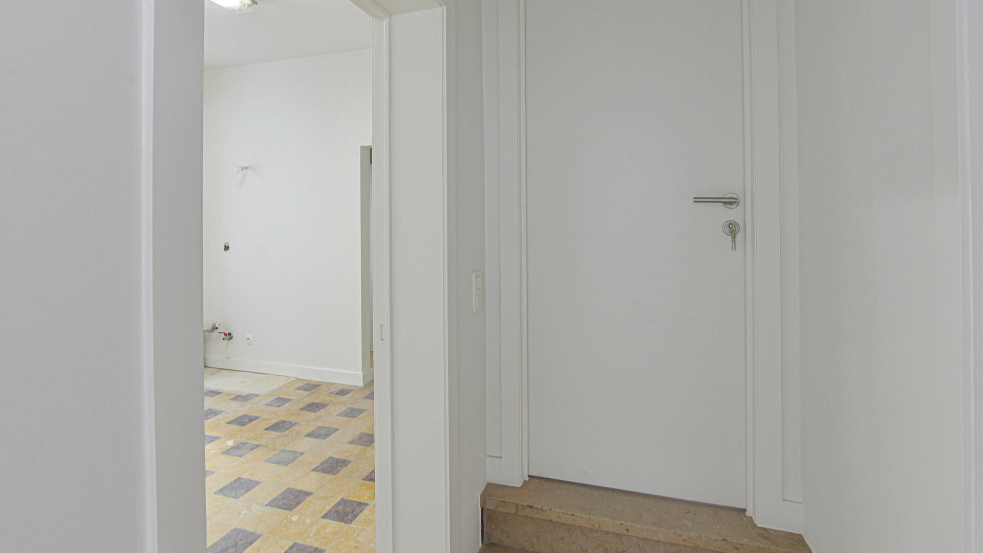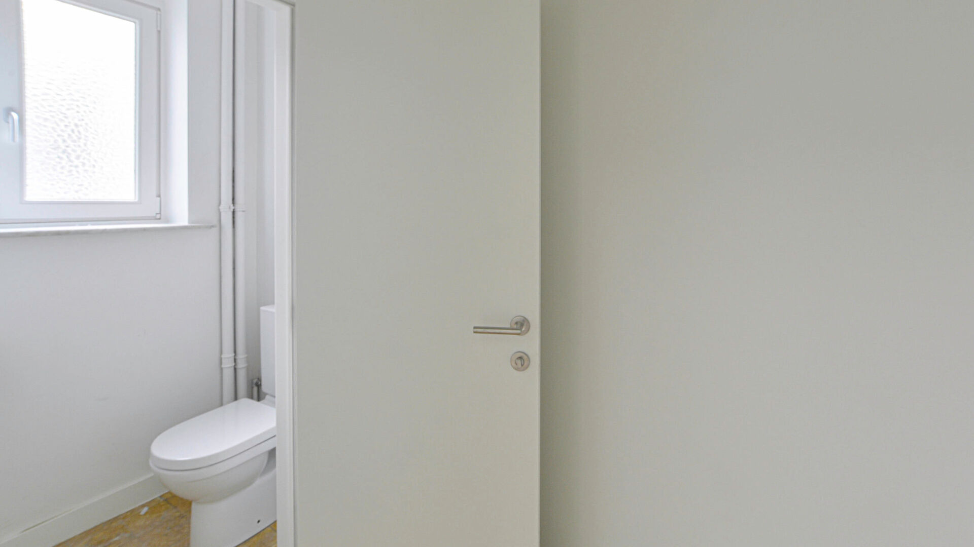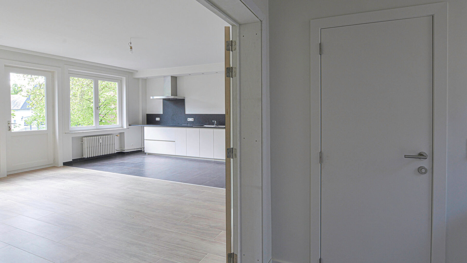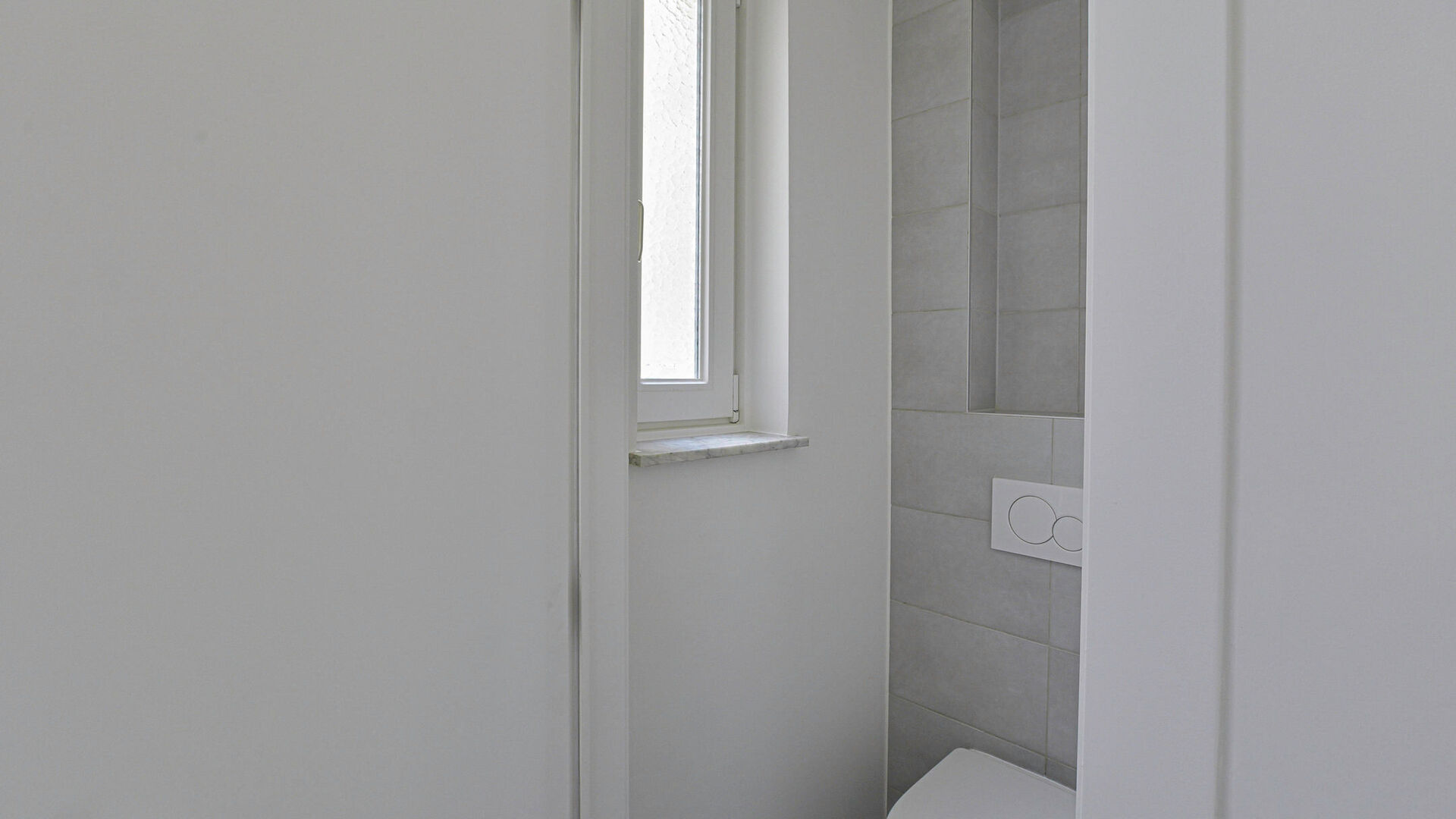 Op de verdieping vindt u een mooi, volledig gerenoveerd appartement van ongeveer 98 m². Het bestaat uit een inkomhal met ingebouwde kast en apart toilet, een lichtrijke woonkamer met volledig uitgeruste open keuken (inductiekookplaat, oven, microgolfoven, koelkast, diepvriezer, vaatwasser) van ongeveer 30 m², twee slaapkamers met ingebouwde kasten (±12,6 m² en ±18 m²), en een moderne douchekamer met een wastafel.