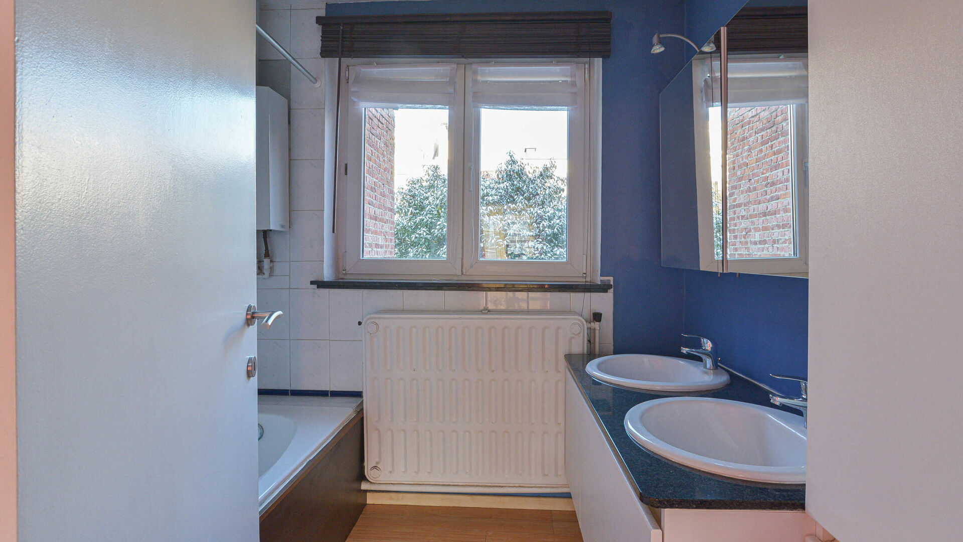 1e verdiep: 2 slaapkamers +/- 17-11m², badkamer met ligbad en wastafel.