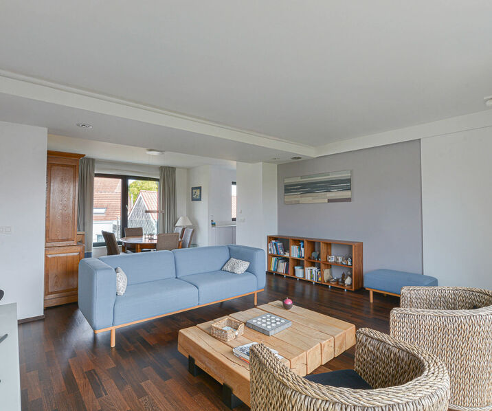 Dit appartement bevindt zich in een recente en standingvolle residentie. Met een bewoonbare oppervlakte van ongeveer 120 m² (2de verdieping op 3) bestaat het uit een inkomhal met apart toilet, een ruime en lichtrijke woon- en eetkamer die uitgeeft op een prachtig zuidgericht terras, ideaal om buiten te eten of te ontspannen.