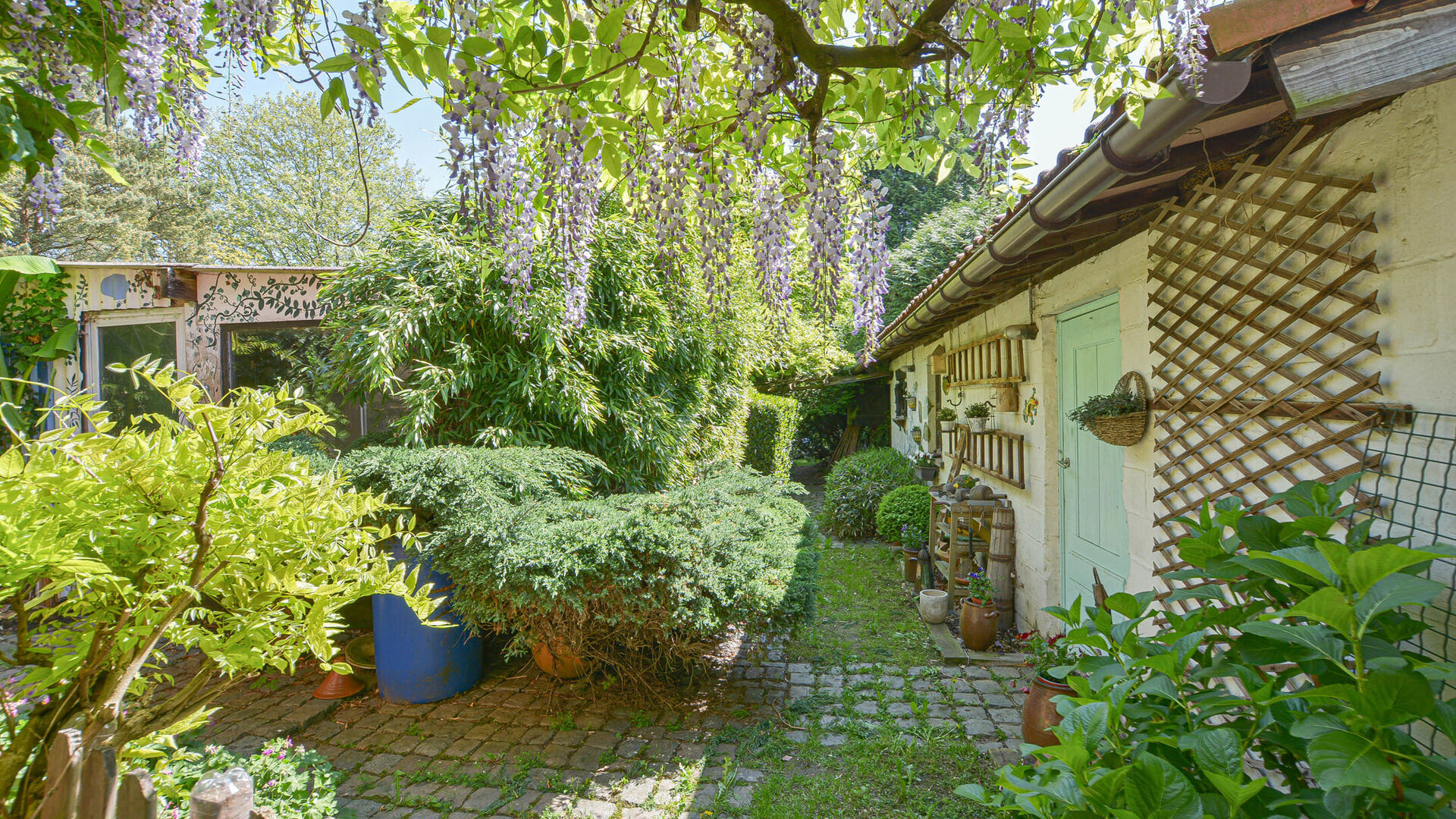 Daarnaast beschikt de woning over een prachtige privatieve tuin zonder inkijk, een binnenkoer/terras, een ruime opslagschuur en garage.